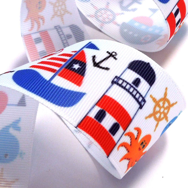 A brightly coloured kid's Nautical Icons printed grosgrain ribbon, 38 mm or 1.5 inch wide with seaside icons on a white background. There are sailing dinghies, lighthouses, anchors, whales, starfish, buoys and other seaside icons all in blue, red, yellow and orange.