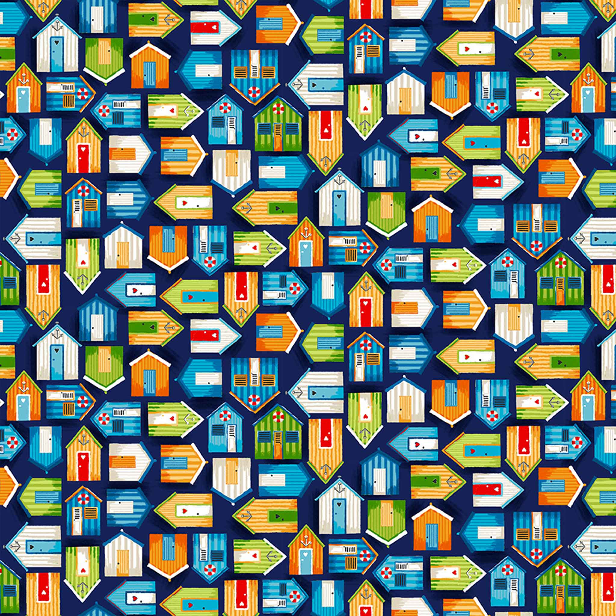 Beach Huts on Blue cotton fabric by Makower, 2345/B, from their Beside The Sea collection. There is an assortment of various beach huts in blue, orange, yellow, red, green and white on a dark blue background.