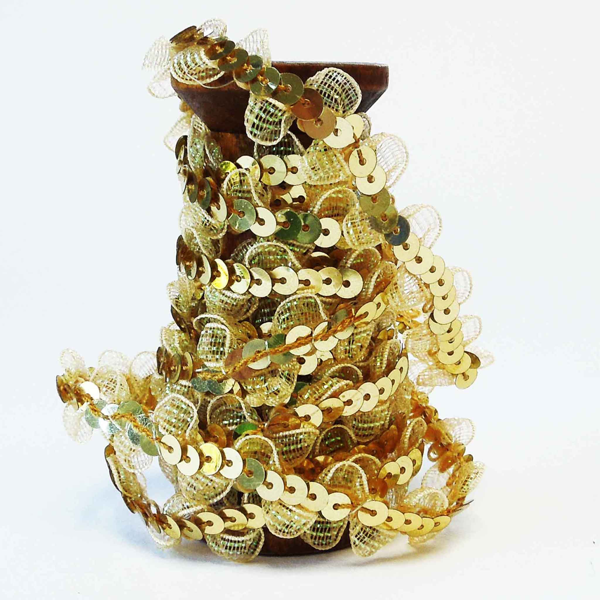 A lovely 15mm Gold Organza Ribbon with Sequins. This is made from a row of 6mm flat strung sequins running down the middle of pretty wavy design of looped semi-transparent gold organza to produce a lovely delicate non-elasticated glitzy sequin trim.