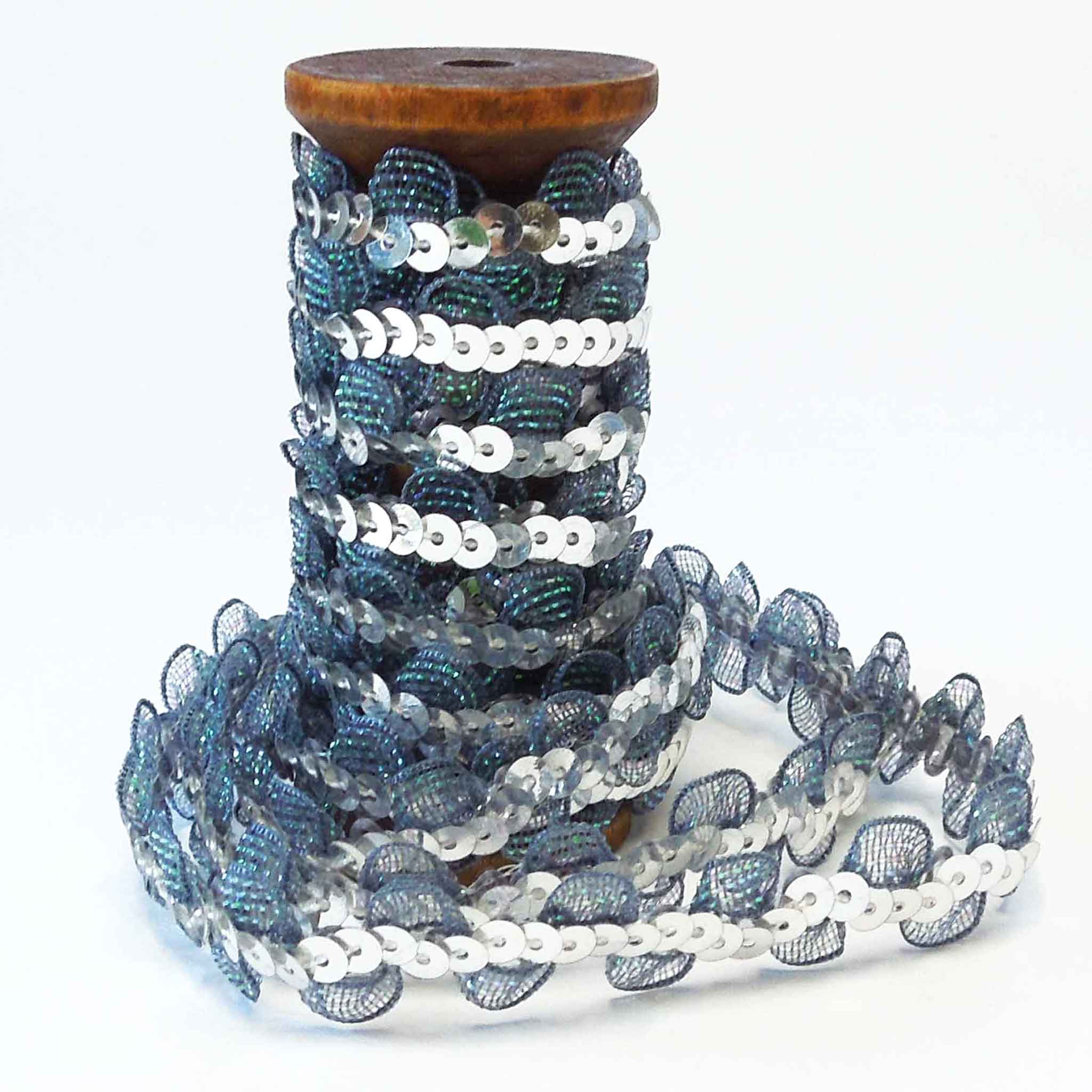 A lovely 15mm Silver Organza Ribbon with Sequins. This is made from a row of 6mm flat strung sequins running down the middle of pretty wavy design of looped semi-transparent silver organza to produce a lovely delicate non-elasticated glitzy sequin trim.