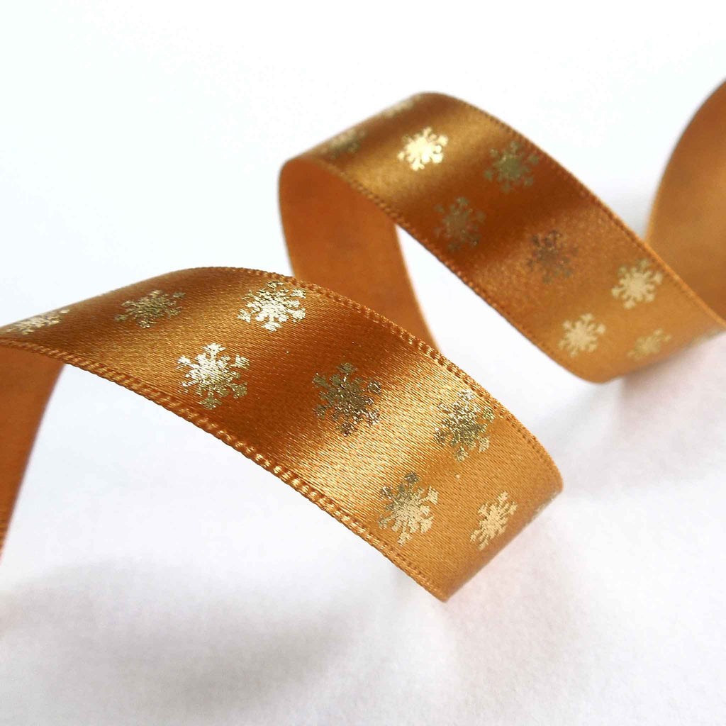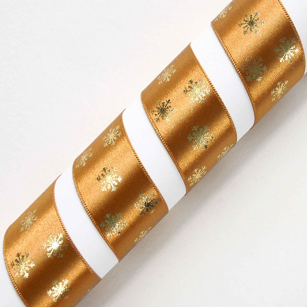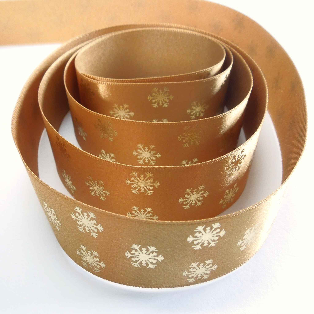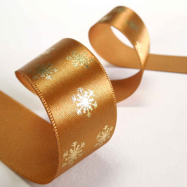 A scattering of gold metallic snowflakes on an old gold background. They run along one side of this lovely ribbon. Customise your Christmas table of festive wreath with hand tied bows for a stylish and chic finish.