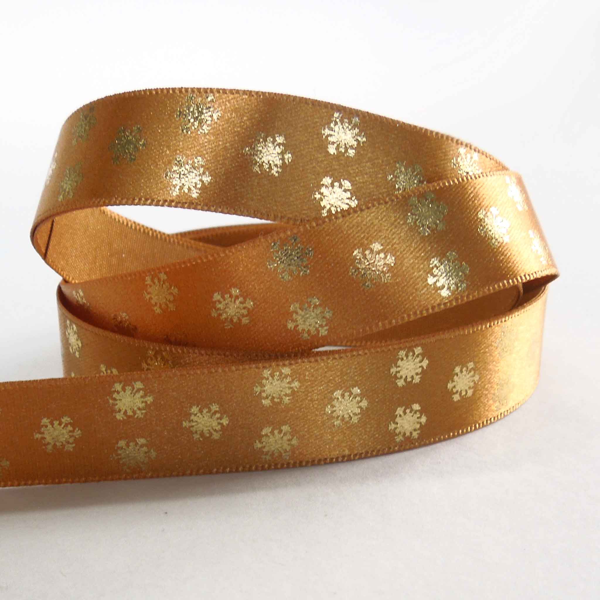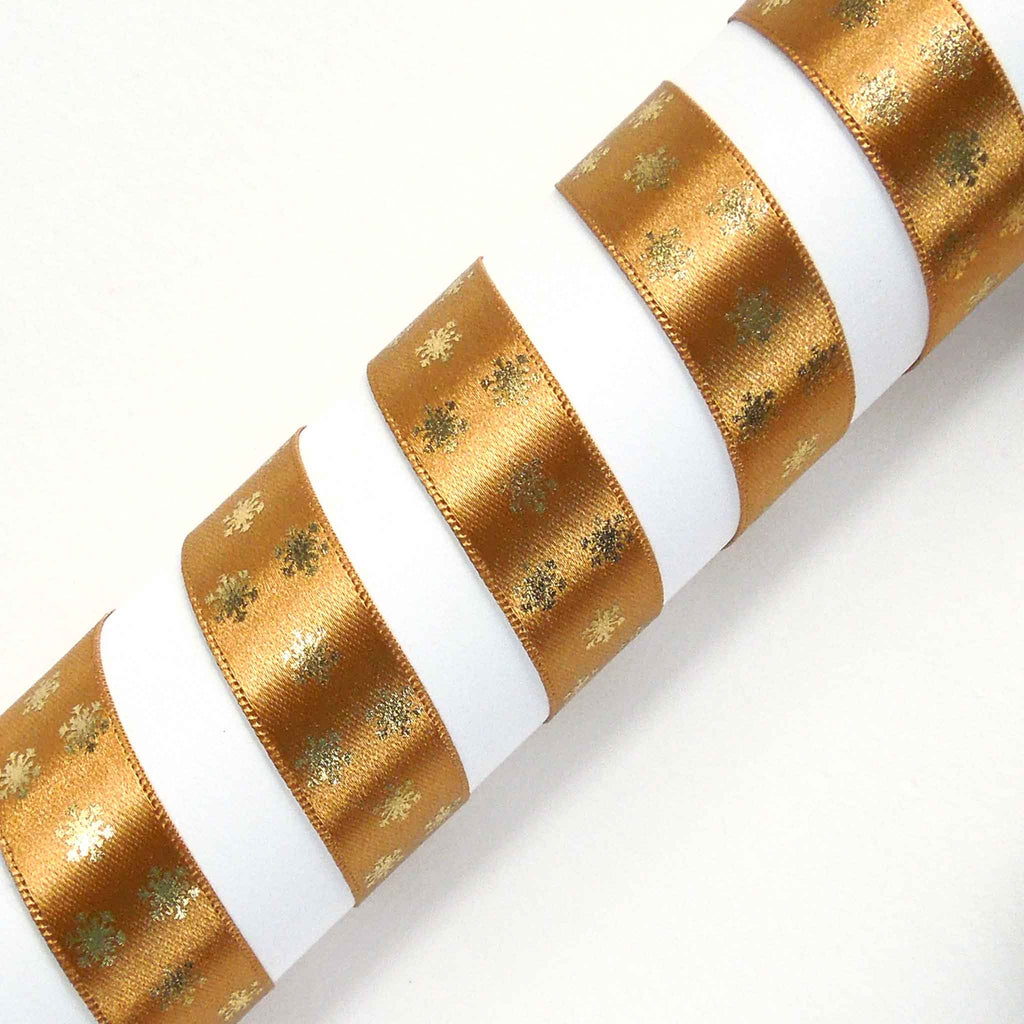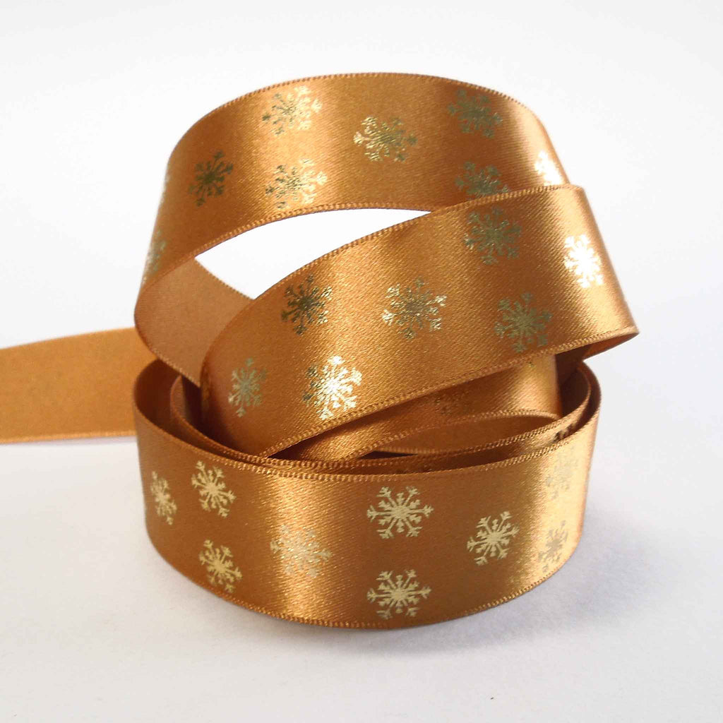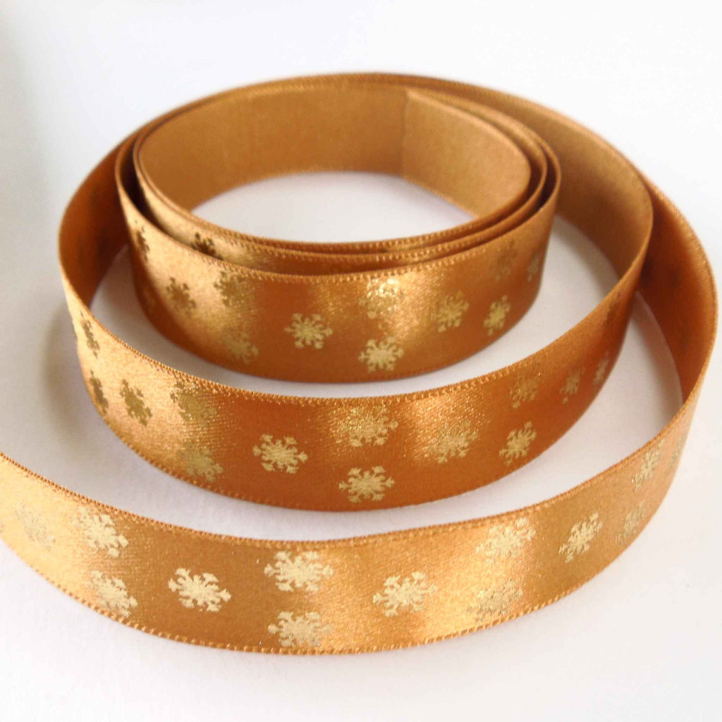 A scattering of gold metallic snowflakes on an old gold background. They run along one side of this lovely ribbon. Customise your Christmas table of festive wreath with hand tied bows for a stylish and chic finish.