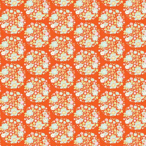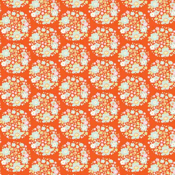 This pure cotton fabric with a pretty floral design, Flower Nest Ginger, TD 481307 is part of the Tilda Bumblebee Collection and features features circular flower clusters in a pretty pastel design in grass green, teal, pink and orange on a ginger coloured background.