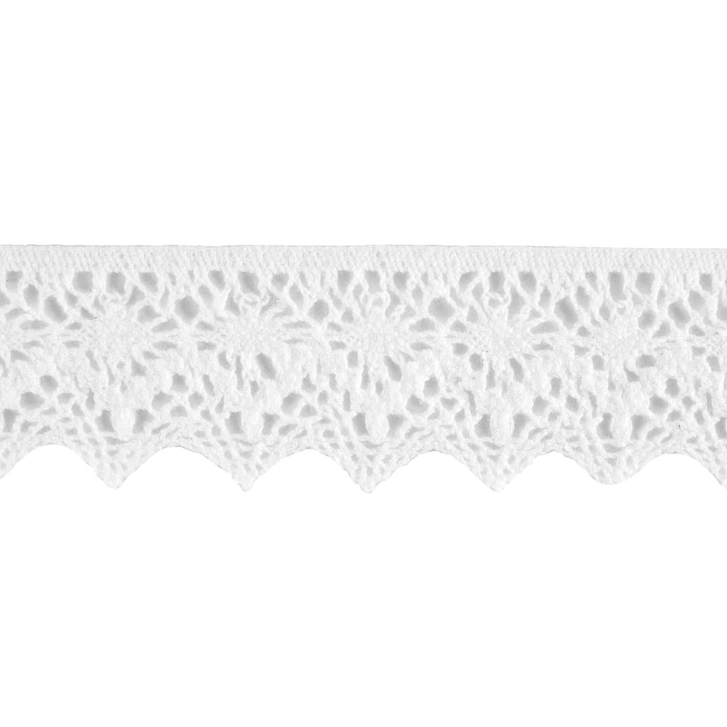 This is a pretty 50mm white cotton lace. The cotton lace has an openwork central decorative pattern , a straight top edge and a pretty scalloped bottom edge.