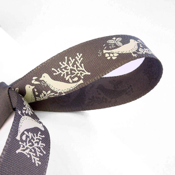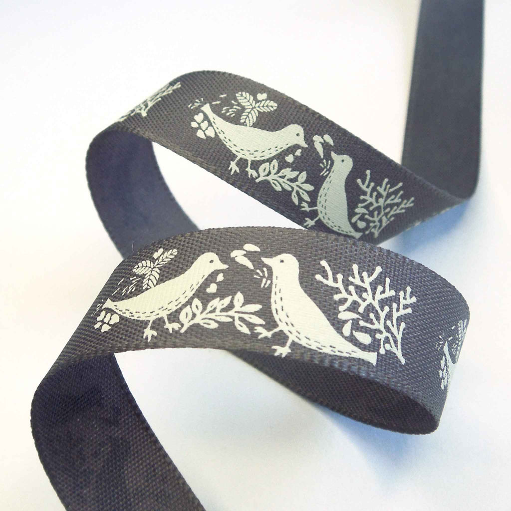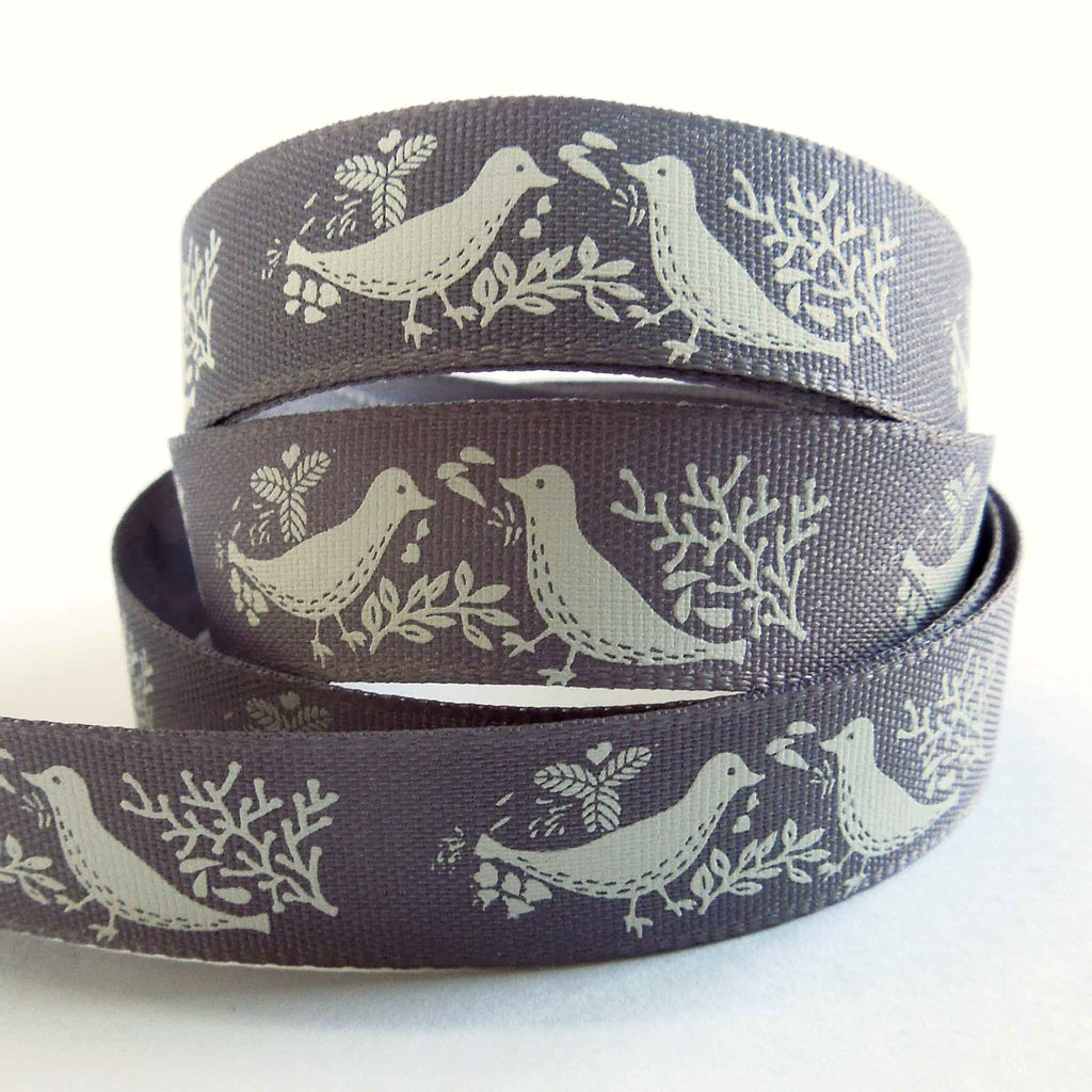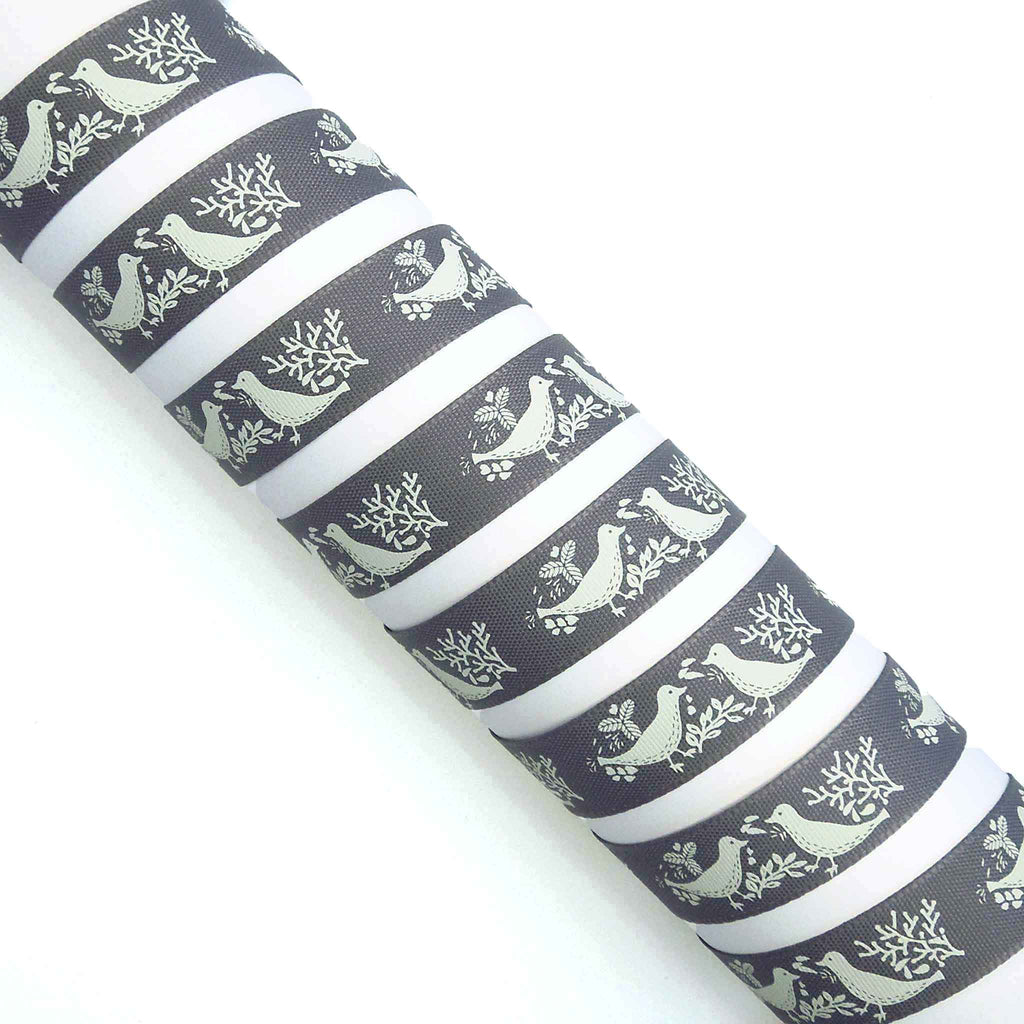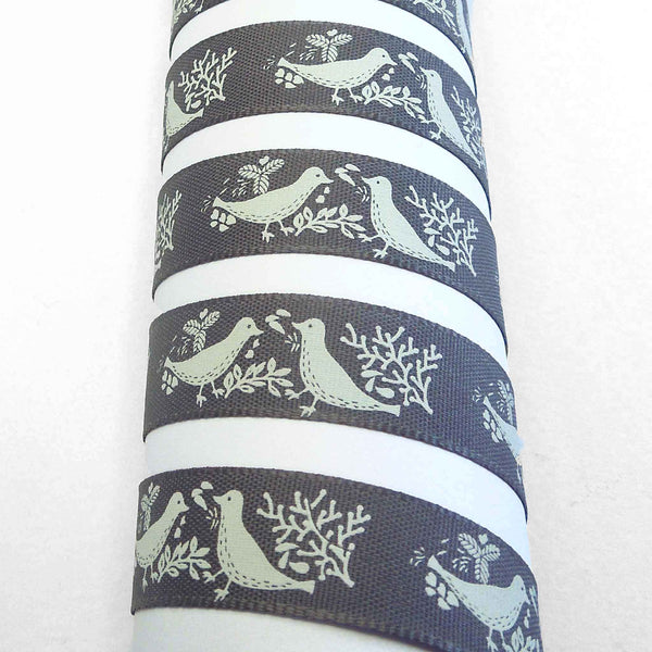 A pretty smoked grey Turtle Dove Ribbon, 15mm or 5/8 inch wide with a lovely pattern of pairs of cream or off-white turtle doves on a grey background.. The birds are facing each other and surrounded by leaves and twigs all in a cream colour on an deep red background. Part of Berisfords Woodland Walk Collection in the Natural Charms range.