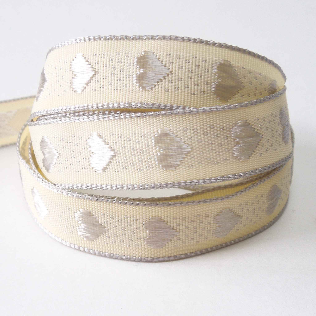 A pretty 15mm silver grey woven heart ribbon. There is a central cream or natural band with silver grey hearts separated by little grey dots running down the length of the ribbon. There are silver grey edges to complete the design of this lovely heart ribbon. This is a woven jacquard ribbon and not printed.