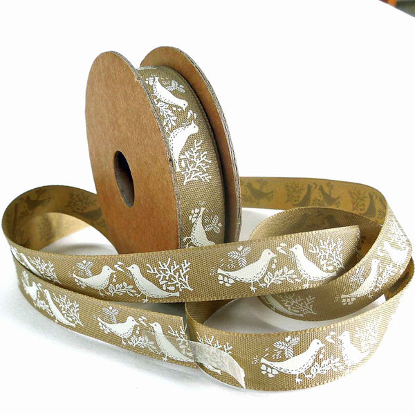A pretty oatmeal turtle dove ribbon, 15mm or 5/8 inch wide with a lovely pattern of pairs of cream or off-white turtle doves on a natural coloured background.. The birds are facing each other and surrounded by leaves and twigs all in a cream colour on an oatmeal or light brown background.