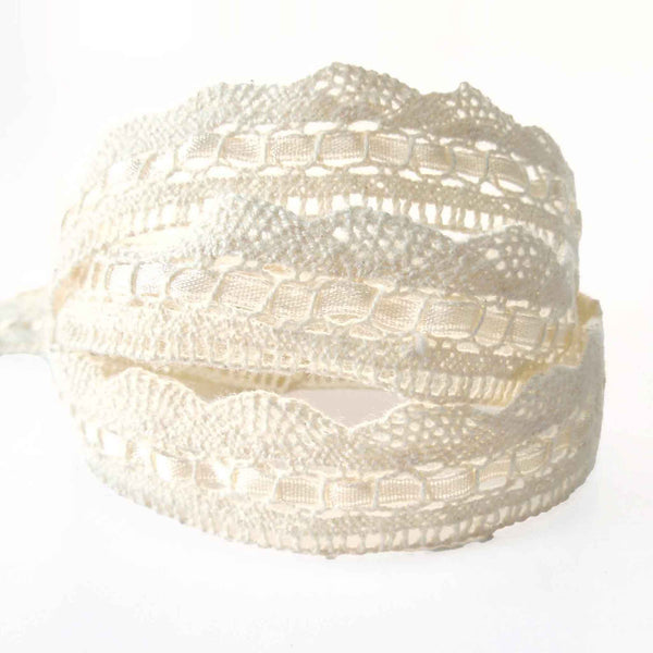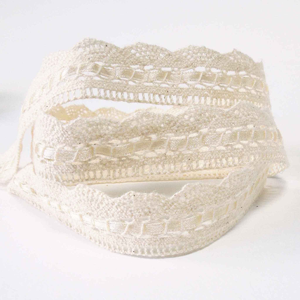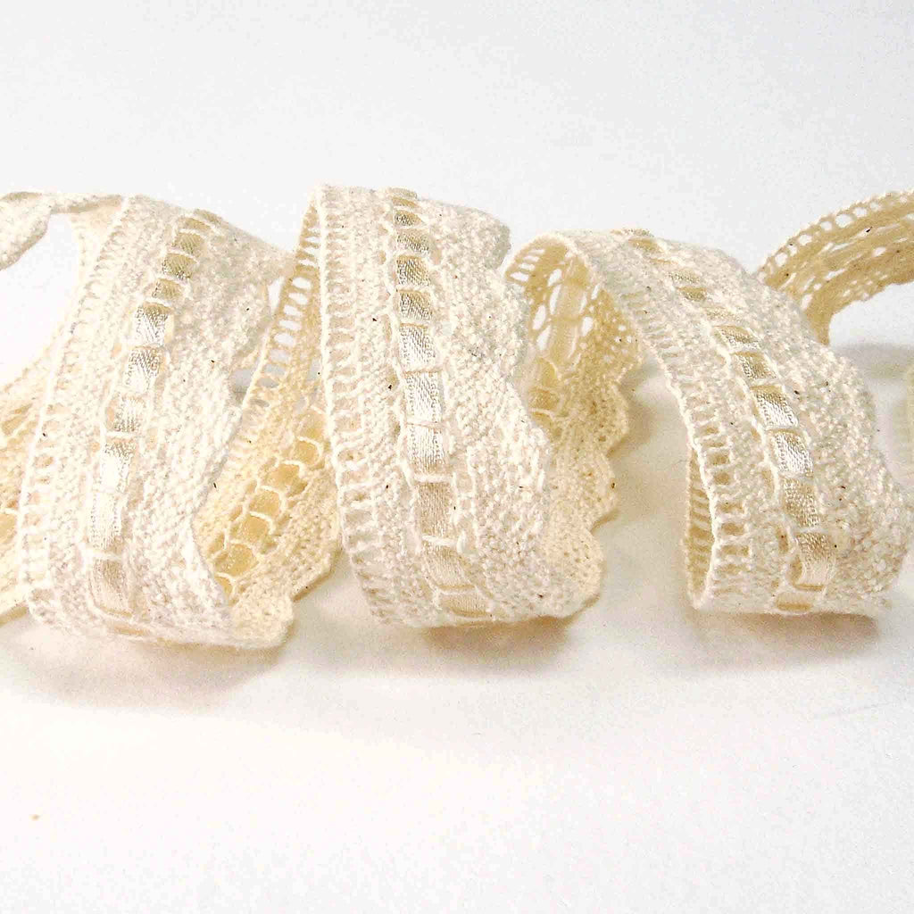 A delicate natural coloured lace threaded with a satin ribbon in the same colour. The lace has a delicate openwork pattern at the top with the ribbon threaded through the lace in the middle and a scallop pattern lace at the bottom. This is a quite a strong, sturdy lace and will hold its shape.