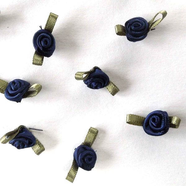 20mm Ribbon Roses - Navy Blue with Green Leaves - Small - Pack of 15