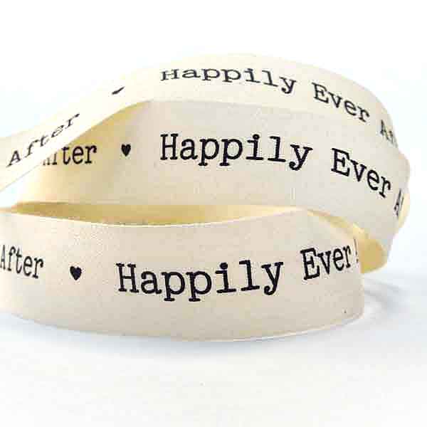 This is a lovely 22mm cream cotton wedding ribbon. The words 'Happily Ever After' are printed in black running down the middle of the off-white or cream cotton tape separated by little black hearts. The ribbon is a neutral colour in order to fit into many different wedding colours schemes.