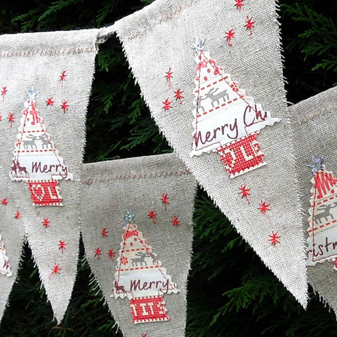 Coloured Christmas Tree Hessian Bunting - Handmade - Cream, Red and Green