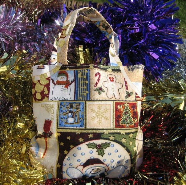 These lovely Christmas handbags are handmade in 4 different festive Christmas cotton fabrics and fully lined in pure white cotton. The handles are made of the same Christmas fabric and top-stitched to ensure that they keep their shape.