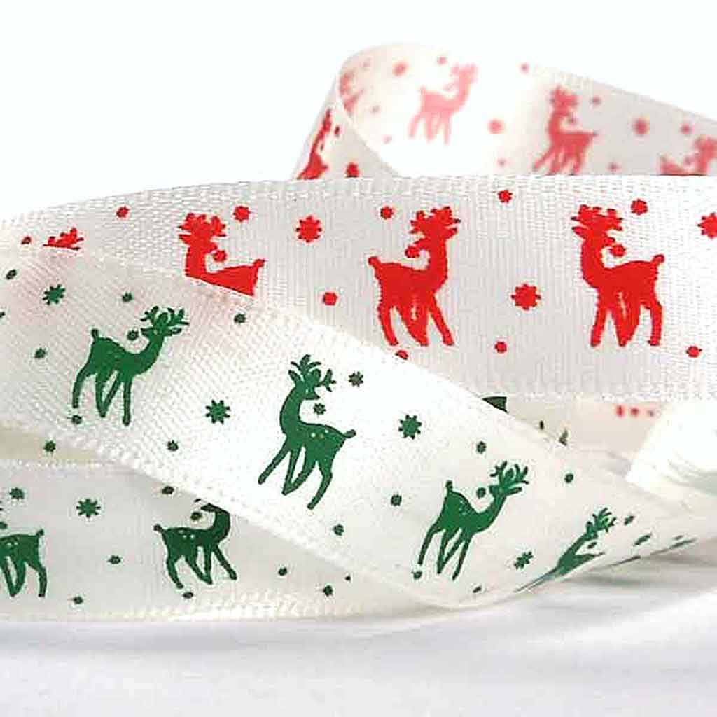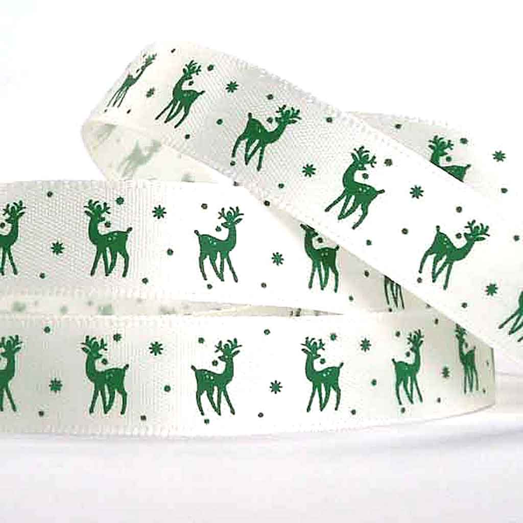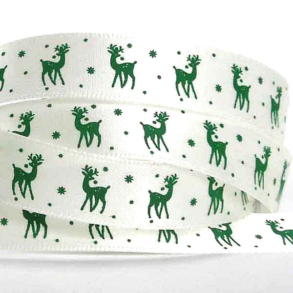 A lovely Christmas green reindeer satin ribbon 15mm or 5/8 inch wide with green reindeer on a white background with little green snowflakes or stars scattered across the white satin.