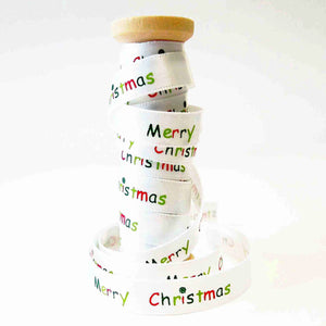 A festive Christmas ribbon 10 mm or 3/8 inch wide. There is Merry Christmas in red, dark green and pale green on a white satin ribbon and wound onto a wooden spool. This ribbon is perfect for all your crafts and gift wrapping.