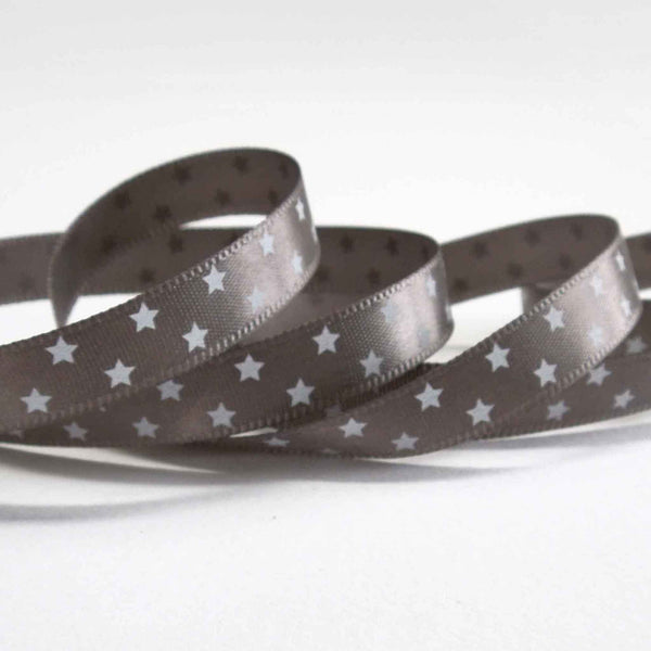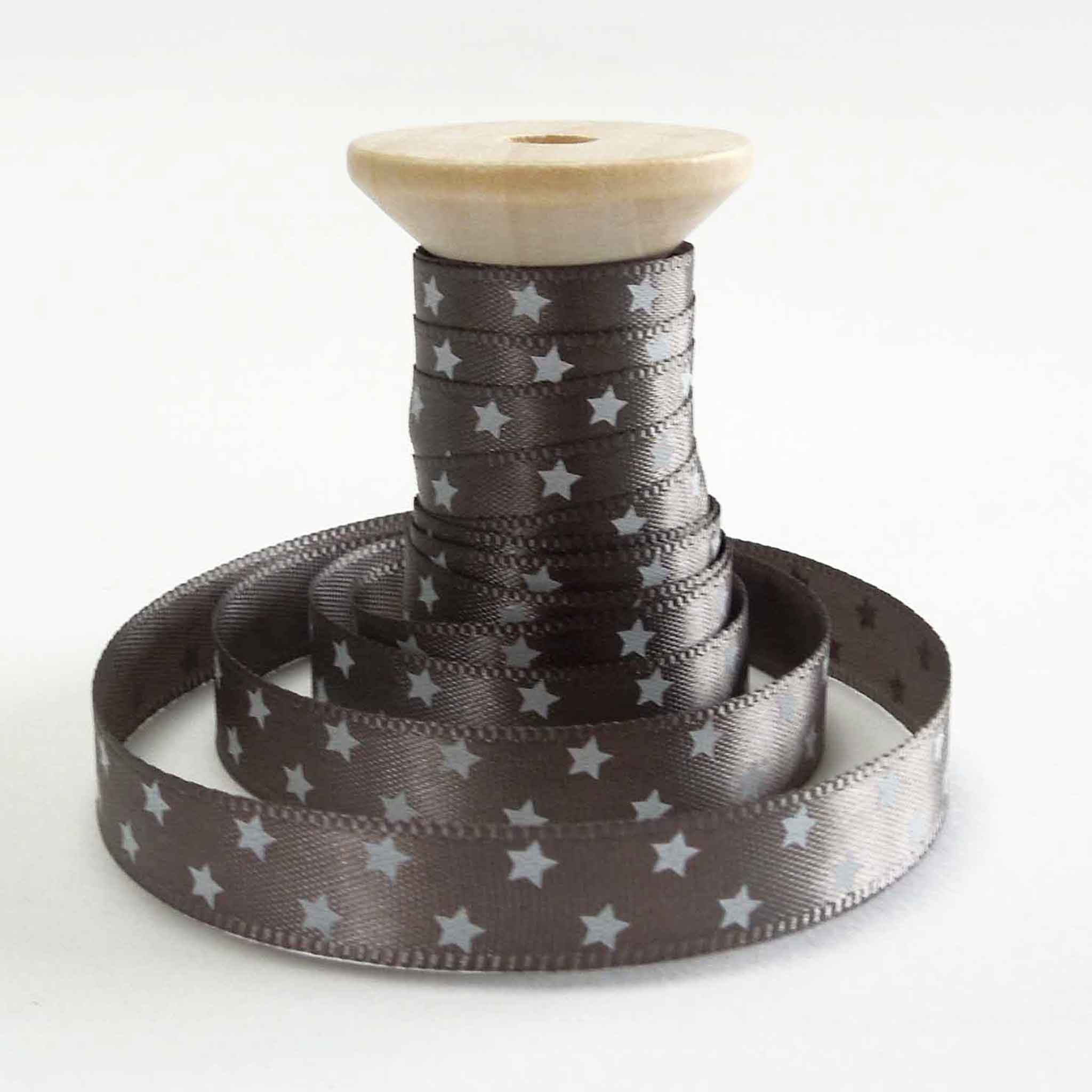 A lovely white stars on grey satin ribbon, 10 mm or 3/8 inch wide. There are little white stars on a grey background running down the length of the ribbon and wound onto a wooden spool. This ribbon is perfect for all your craft projects and gift wrapping.