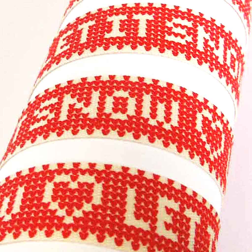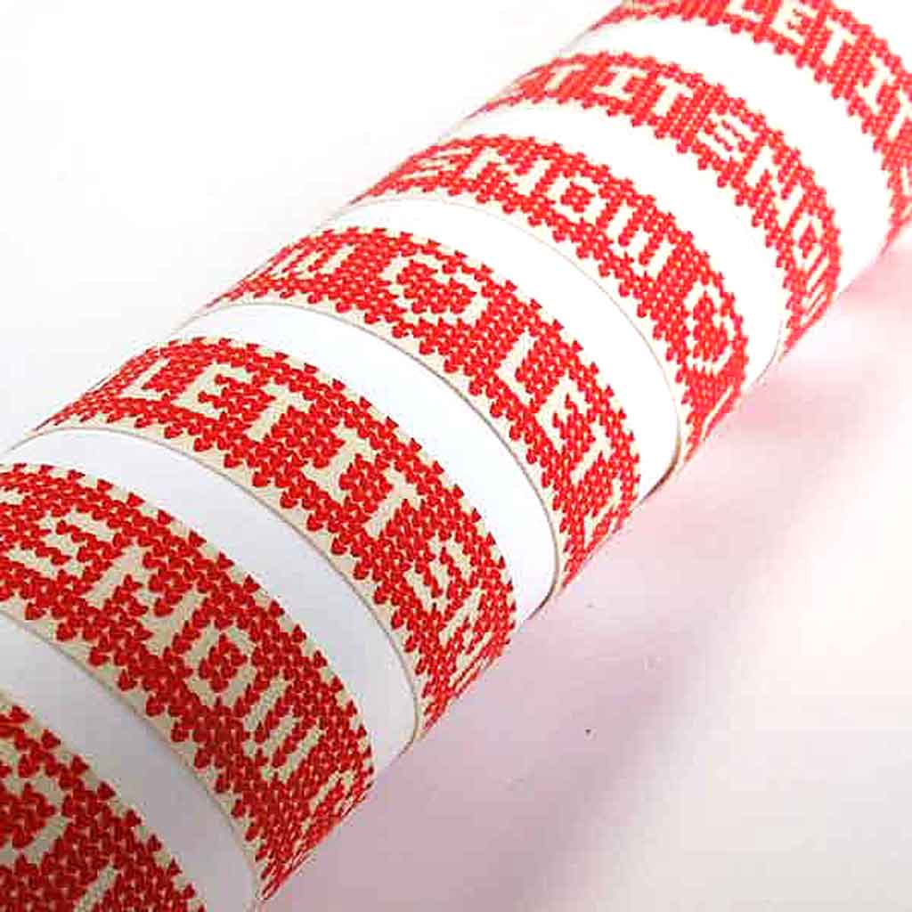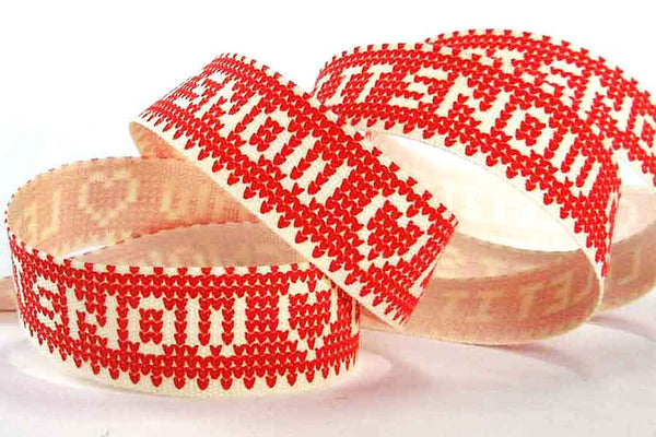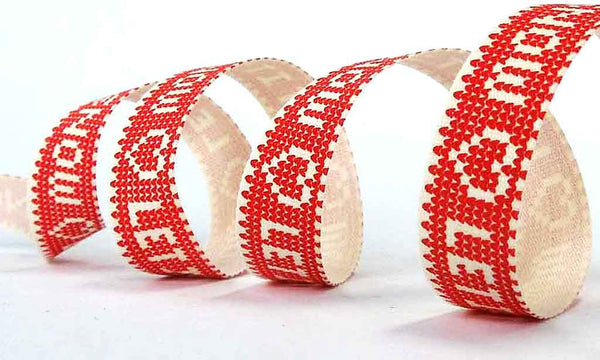 A Red Christmas Let It Snow Printed Cotton Ribbon, 15mm or 5/8 inch wide with a lovely festive design of Let It Snow Labels separated by hearts in a red and cream design on a cotton tape.