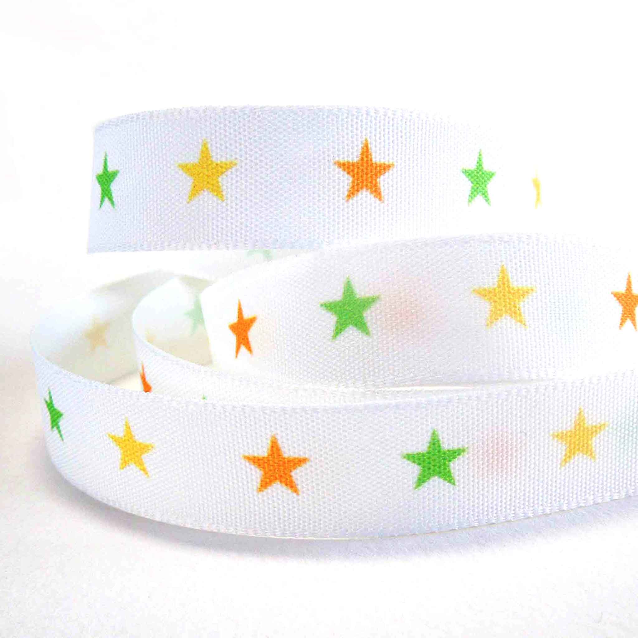 This sweet and versatile star print is perfect for occasions all year round from gift wrapping precious gifts for baby showers to trimming birthday cakes. There are small yellow, orange and green stars in a repeating pattern running the length of the ribbon. It's a must have for your ribbon collection.