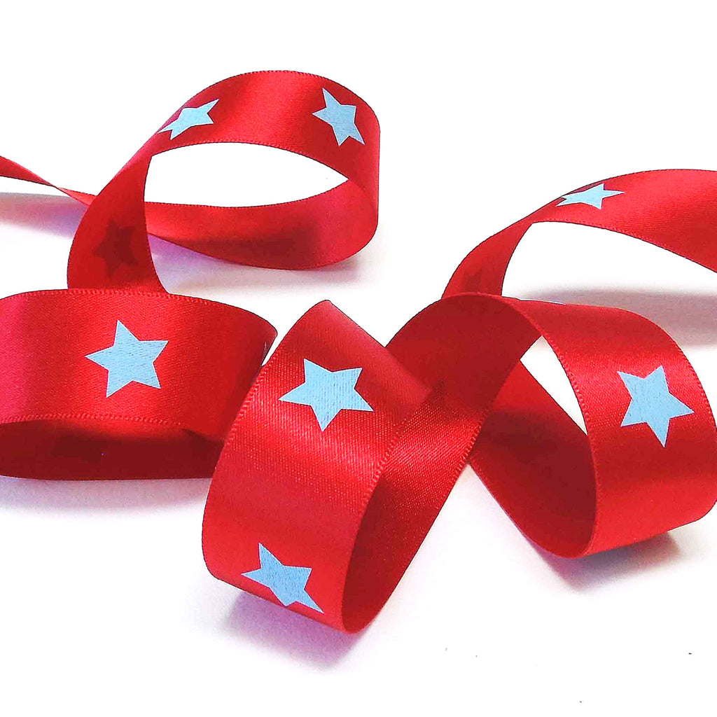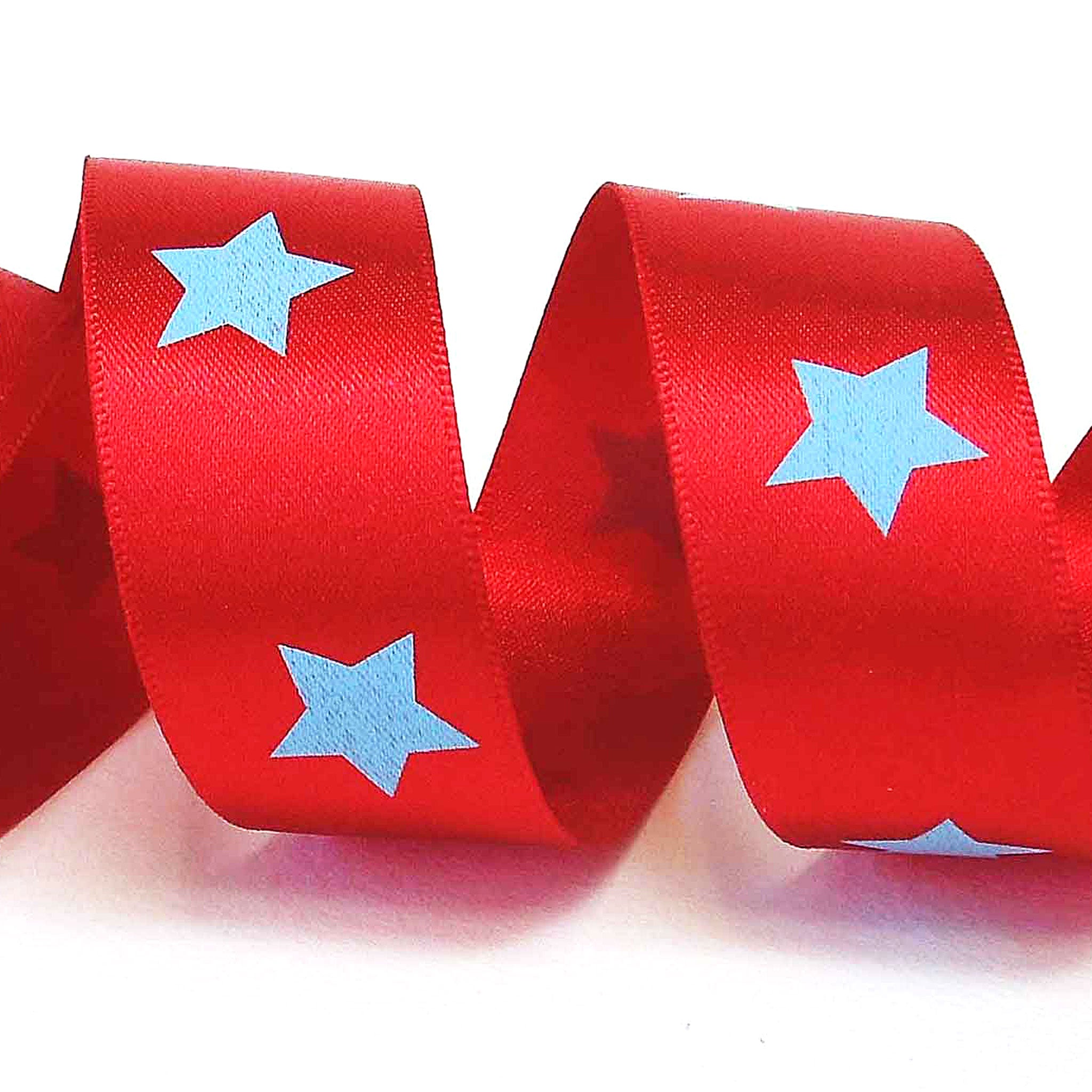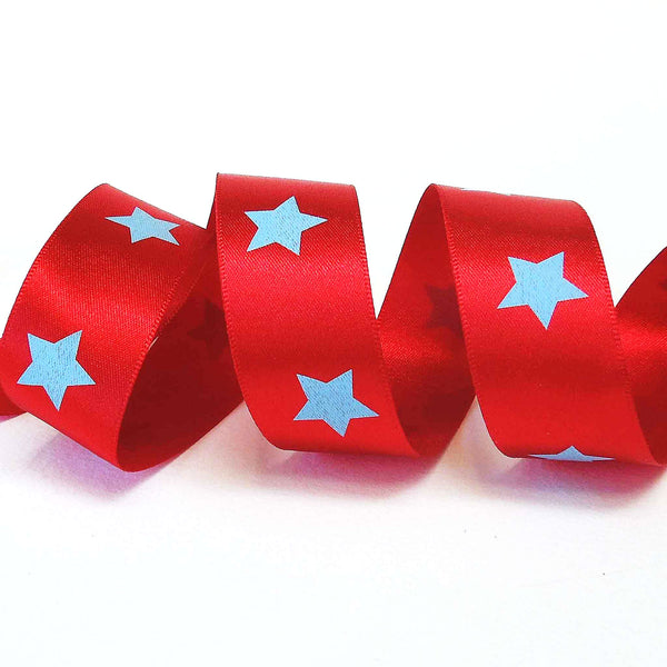 A striking red and blue star satin ribbon, 25mm wide by Berisfords. There are large pale blue stars printed on a red double satin background running the length of the ribbon. A nice heavier weight satin ribbon.