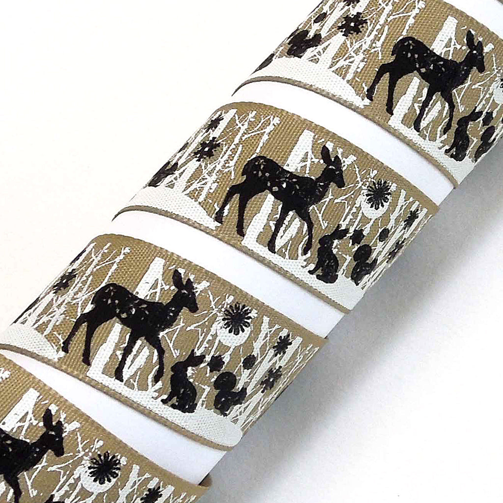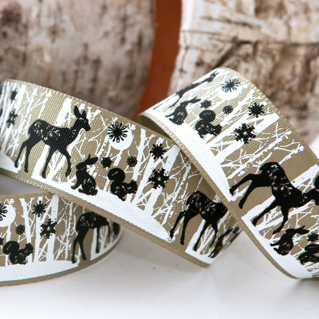 Forest creatures in a winter woodland scene make for a rustic and charming design. A pretty Christmas ribbon with black reindeer, rabbits and squirrels against white trees and branches on an oatmeal background.