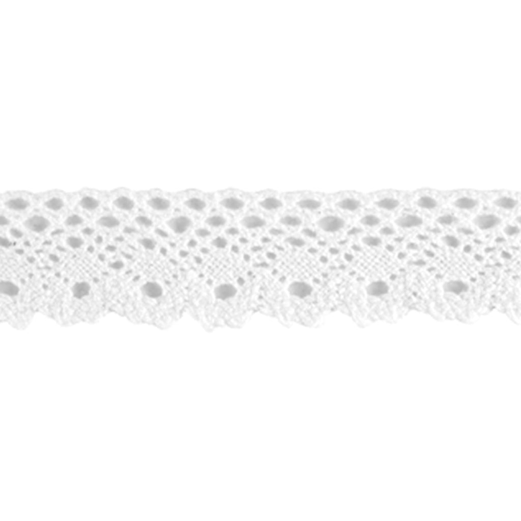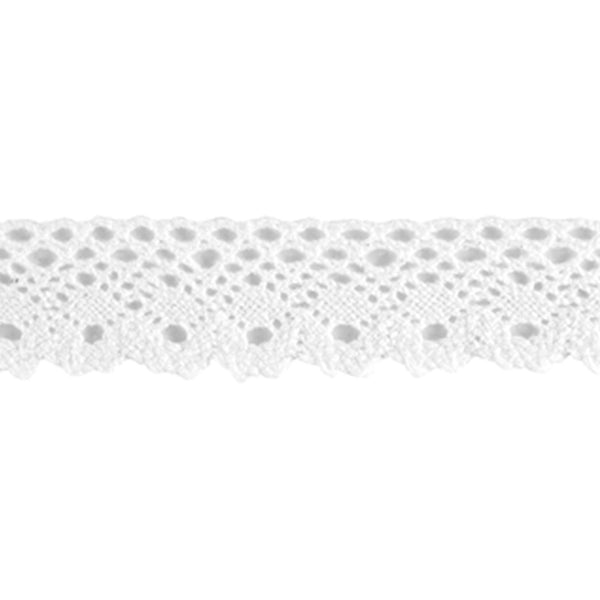 A pretty 26mm white cotton floral flat lace. There a pretty open work top straight band with a decorative bottom edge.