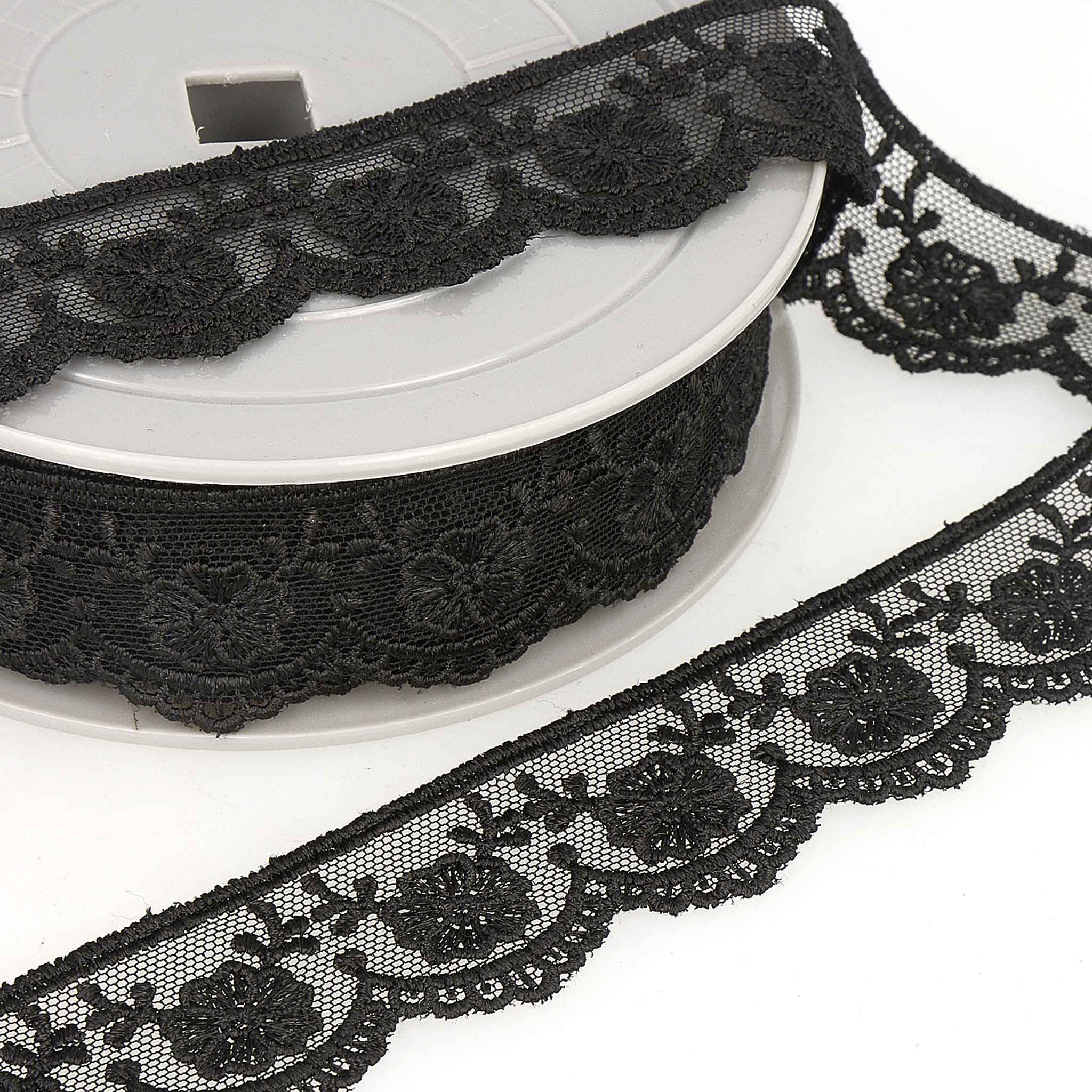 This is a top quality 30mm black embroidered lace tulle by the French brand Stephanoise. The lace has a pretty decorative embroidered pattern and a straight top edge and scalloped decorative lower edge.