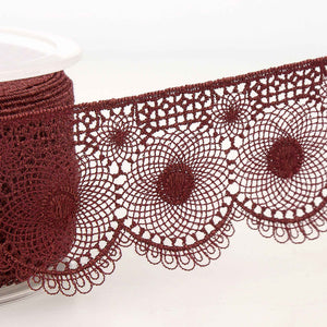 This is a top quality 40mm burgundy embroidered lace tulle by the French brand Stephanoise. The lace has a pretty decorative embroidered pattern with a decorative circular pattern running down the length of the lace and a shaped bottom edge.