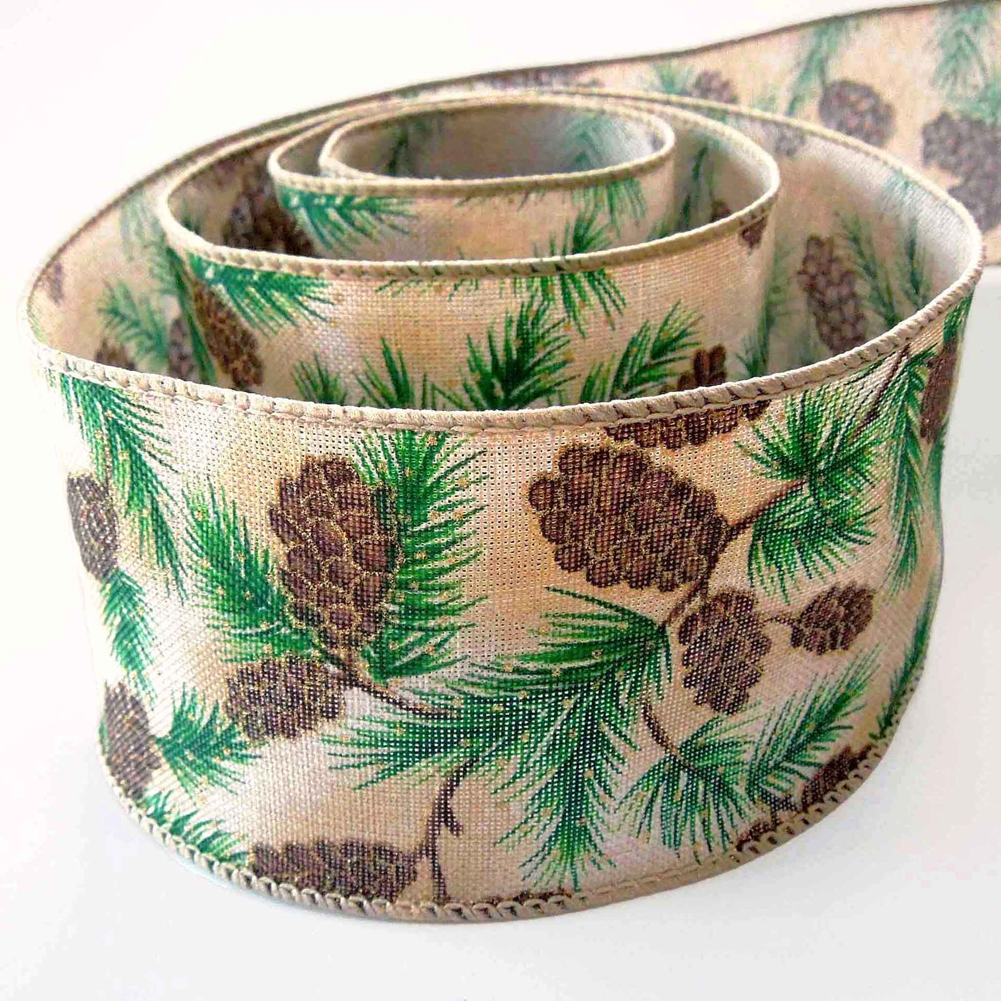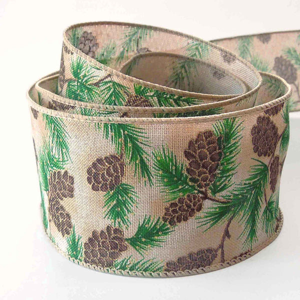 Christmas Pine Cones Ribbon is a luxury 63mm wide wired Xmas decorative ribbon. The brown and gold pine cones together with green foliage decorated with little gold dots are on a natural brown colour textured background. This is a rustic style Christmas ribbon perfect for many different colour schemes.