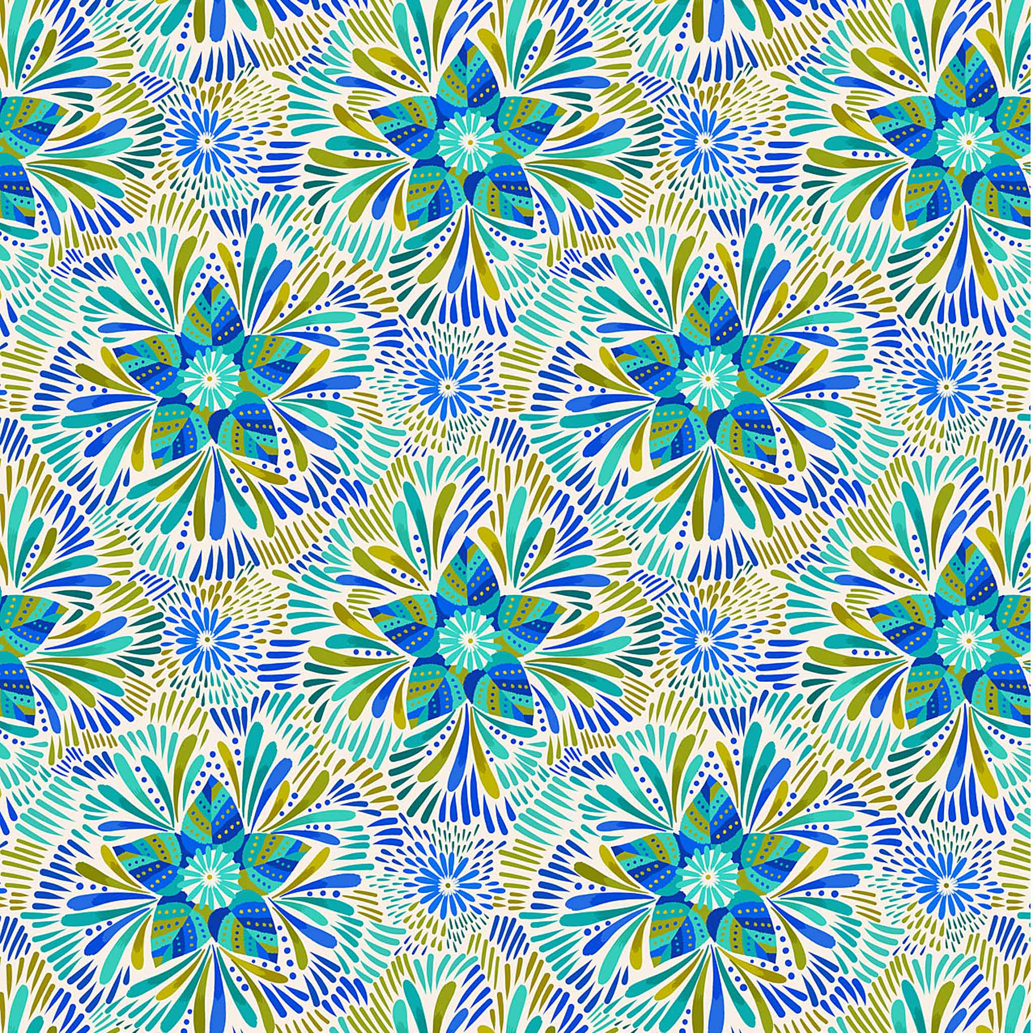 Bahia - Lewis and Irene - Axé Blue and Green Floral on Cream - A810.1 - Cotton Fabric