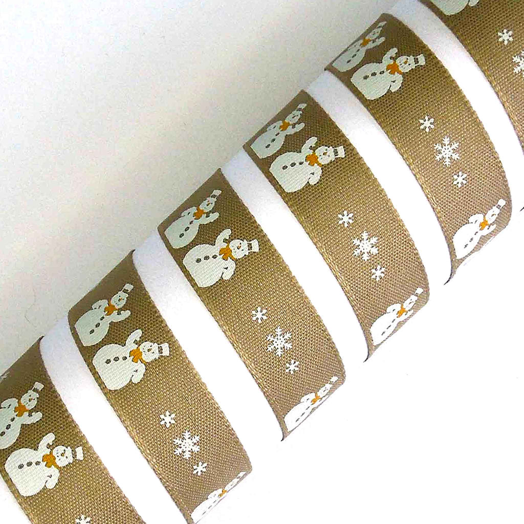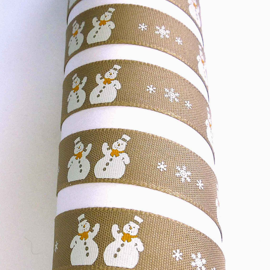A festive design of Christmas Snowmen. There are pairs of white snowmen with hats and scarves around their necks, separated by white snowflakes on an oatmeal background running down the length of the ribbon.Dry clean or wash at 50 degrees. Tumble dry. Cool iron.