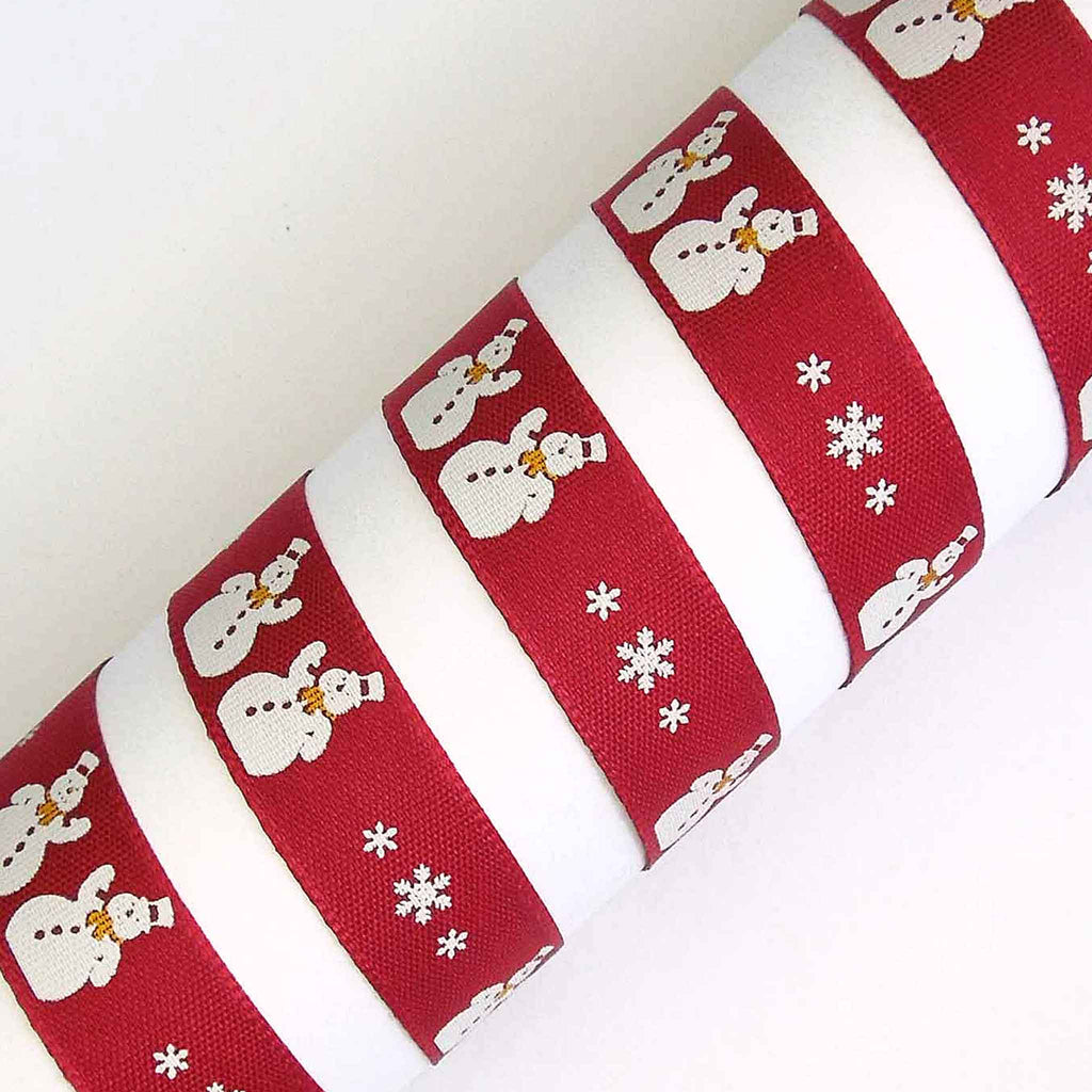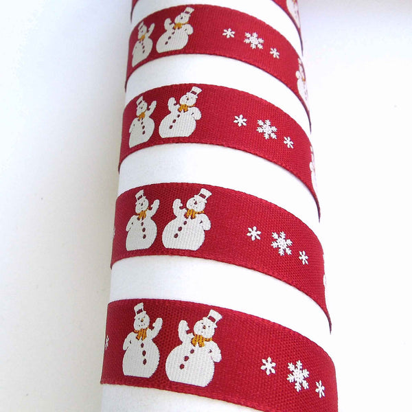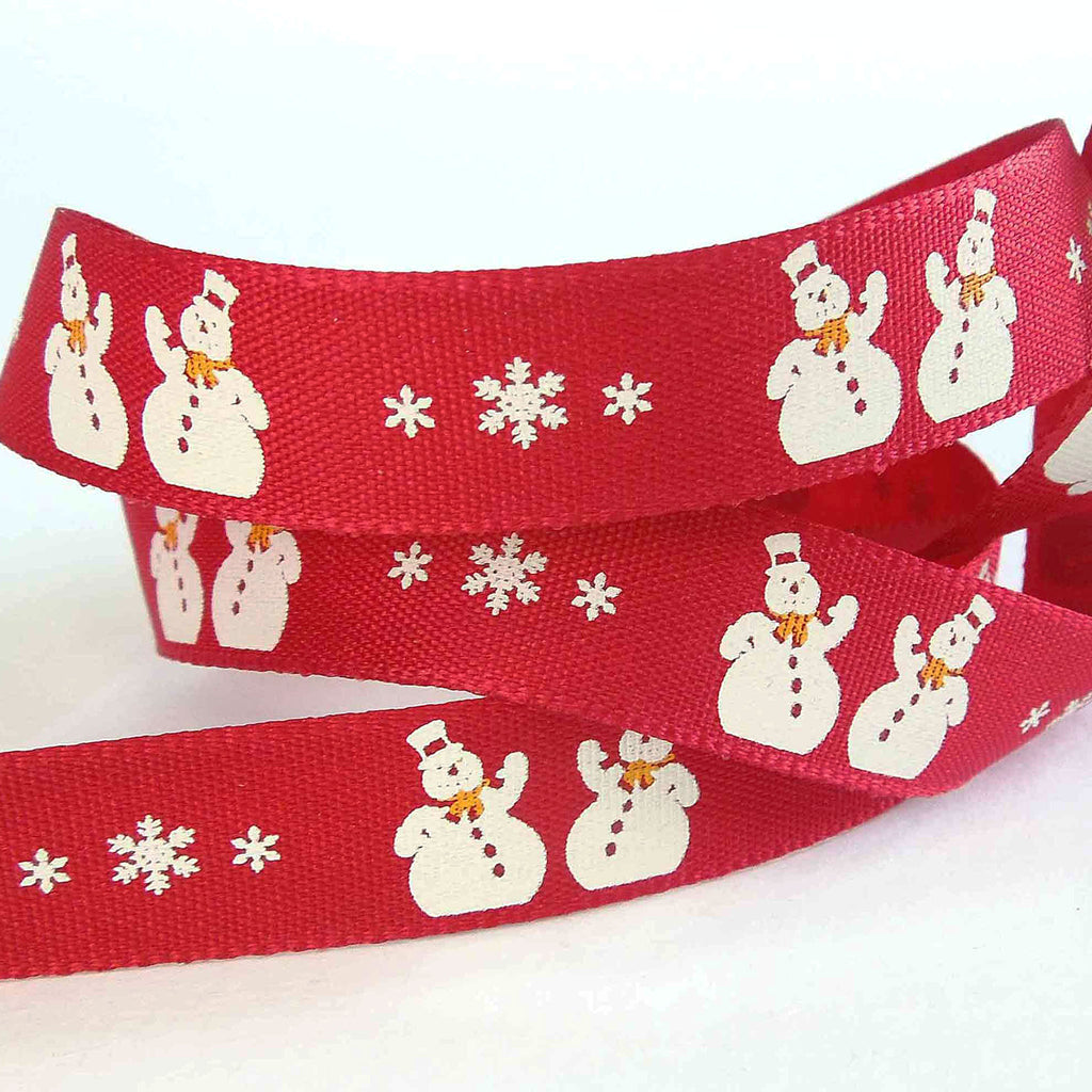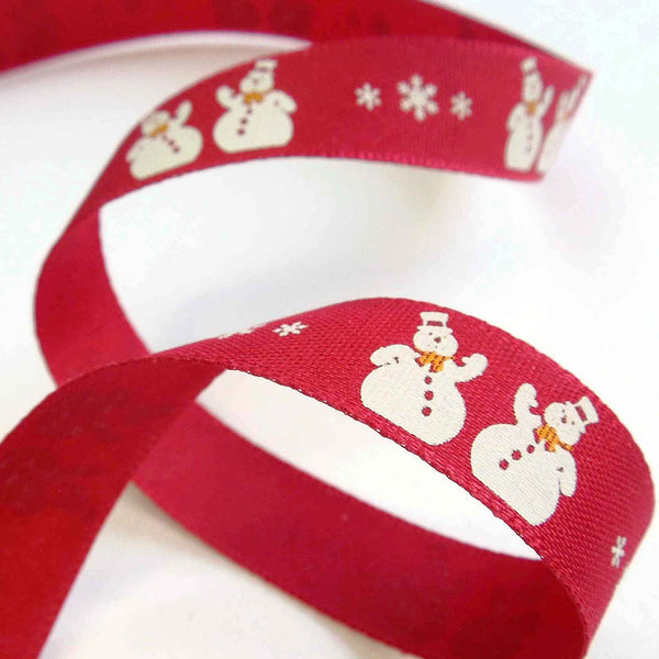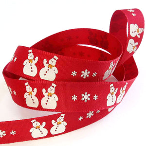 A festive design of Christmas Snowmen. There are pairs of white snowmen with hats and scarves around their necks, separated by white snowflakes on a red background running down the length of the ribbon.Dry clean or wash at 50 degrees. Tumble dry. Cool iron.