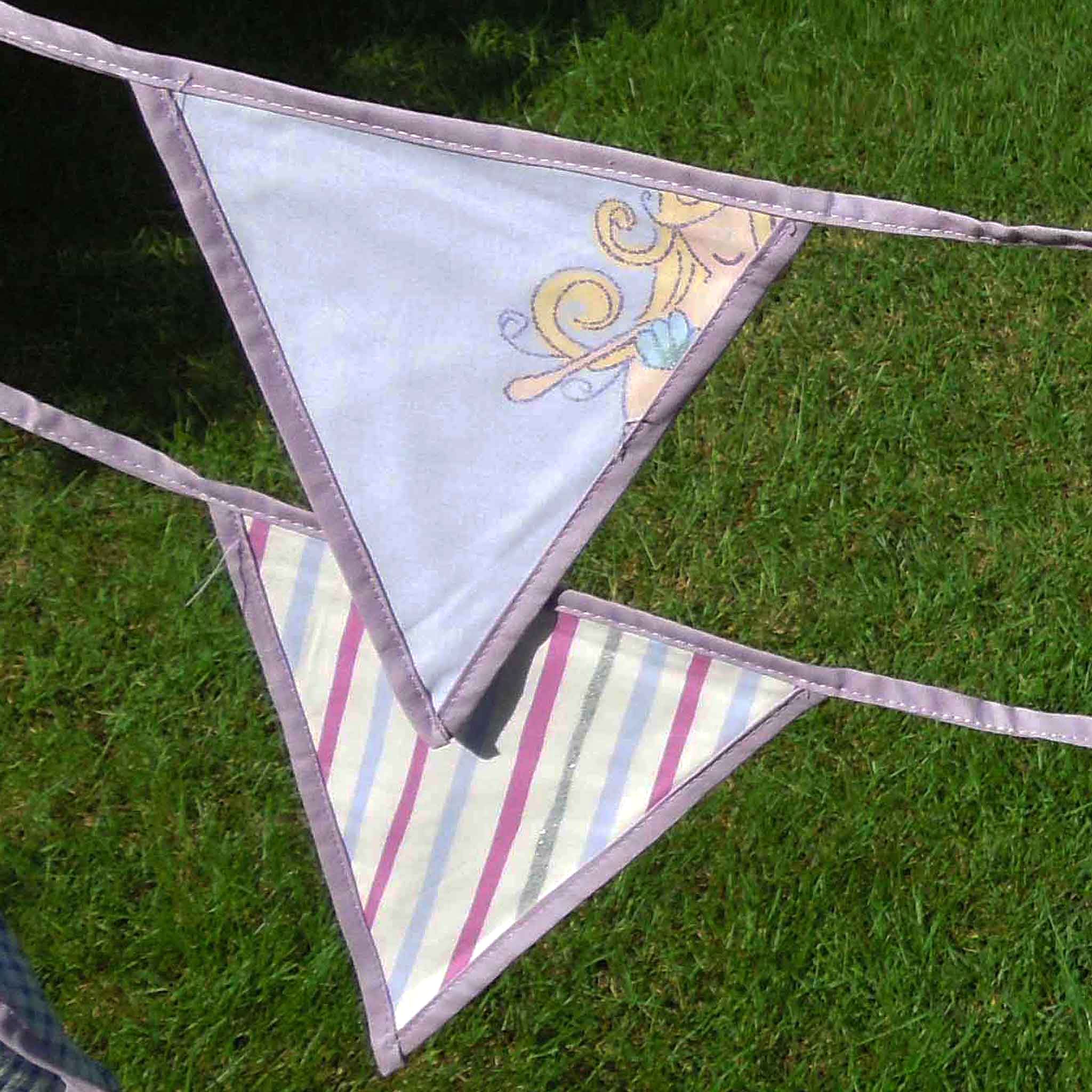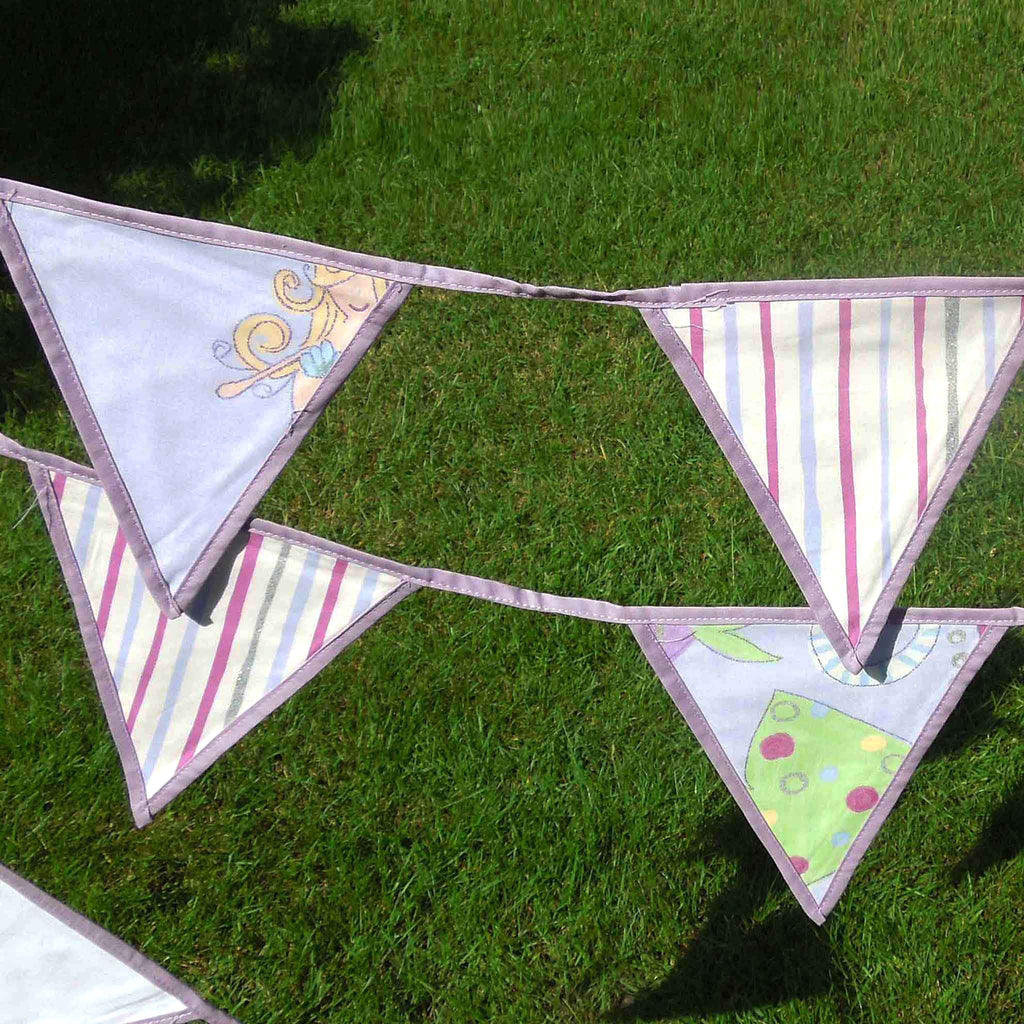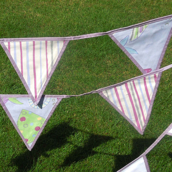 As the bunting is cut from the patterned lilac mermaid fabric, there will be different images appearing on each flag.