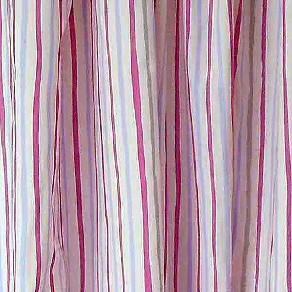 The bunting is made from two different fabrics with alternate flags. One fabric is lilac mermaid with mermaids, sea creatures and fish in shades of lilac, blue, green and silver glitter. The other fabric is lilac and silver shimmer stripe with different wavy stripes lilac, purple and silver on a white background. Both fabrics are lined with white cotton. and edged with lilac cotton tape.