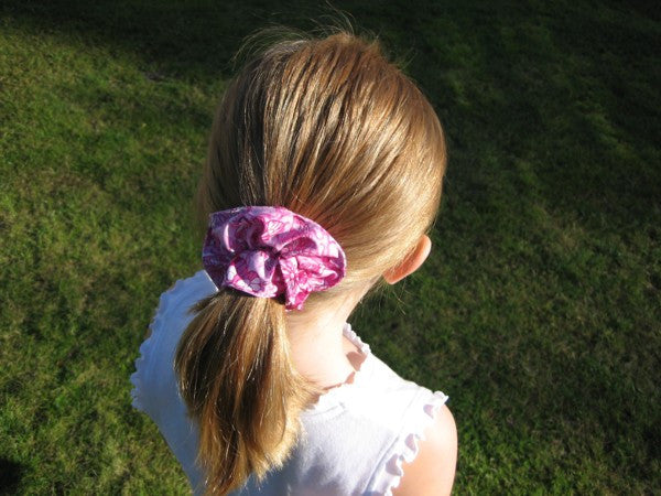 Cotton scrunchies in a choice of 2 different fabrics, blue butterflies and pink butterflies. Both scrunchies are handmade in pure cotton and top stitched in order to retain their shape.