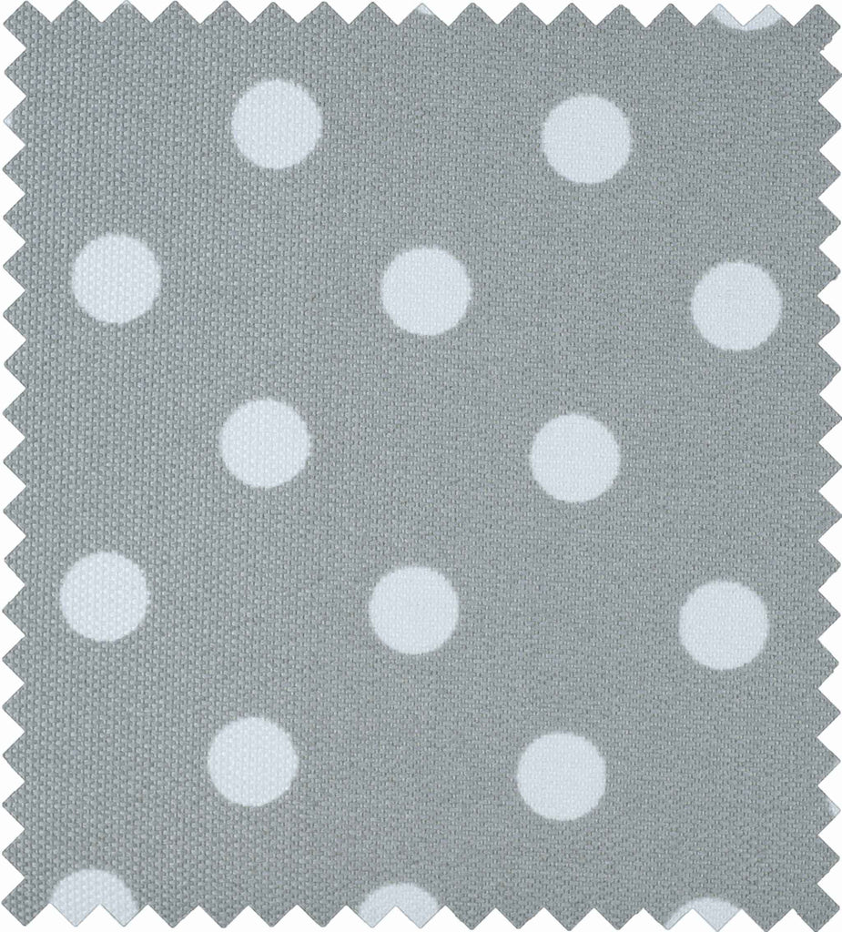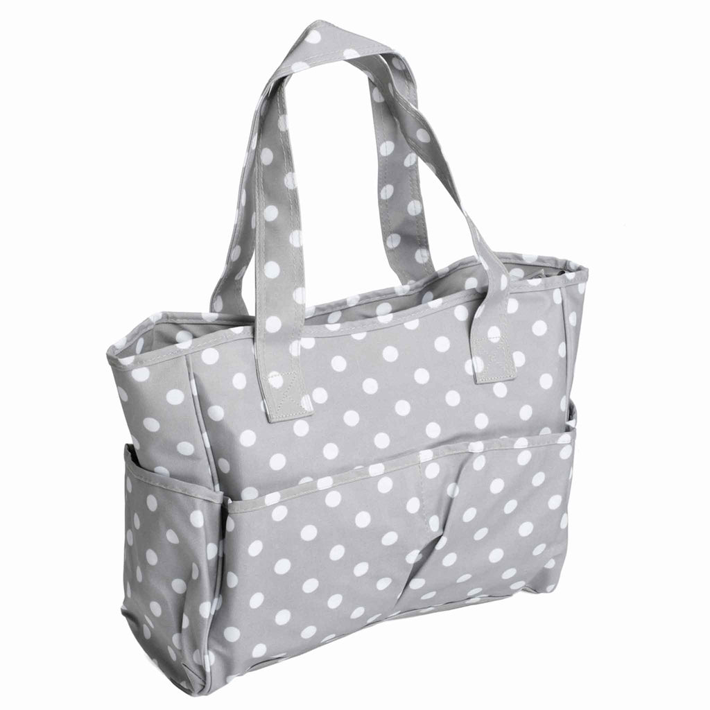 A practical craft bag made from matt PVC coated cotton fabric in a grey spot pattern. The bag's internal lining and the lining of the pockets on the outside of the bag are in a grey fabric. There is a matching grey zip closure.