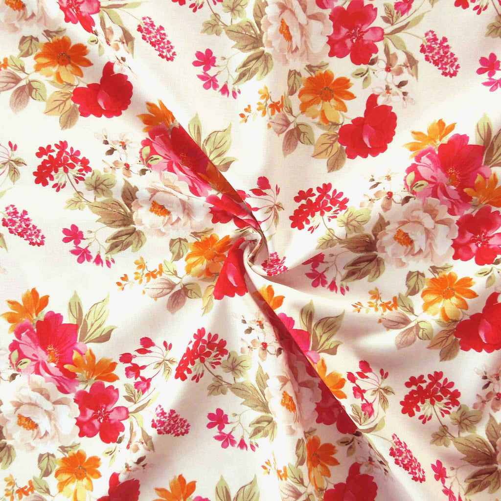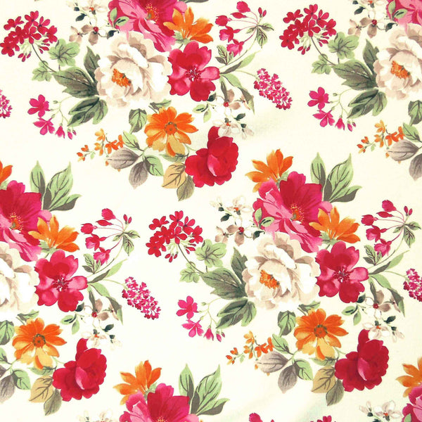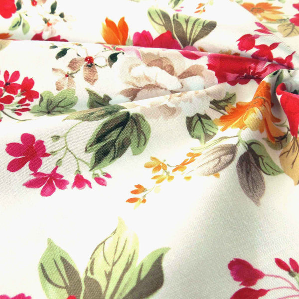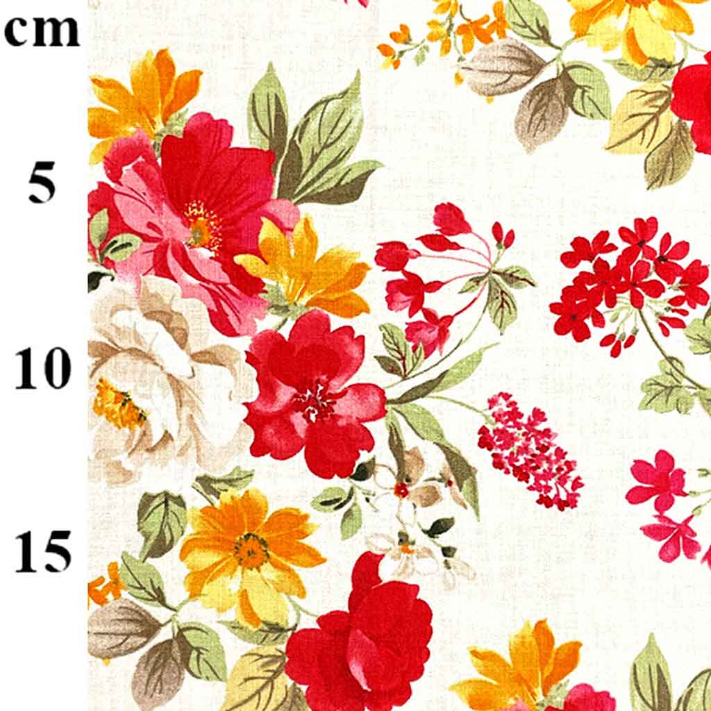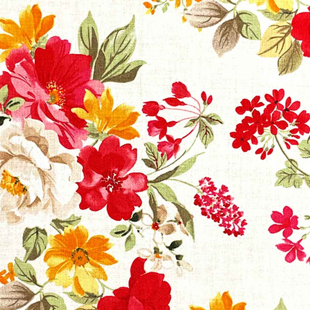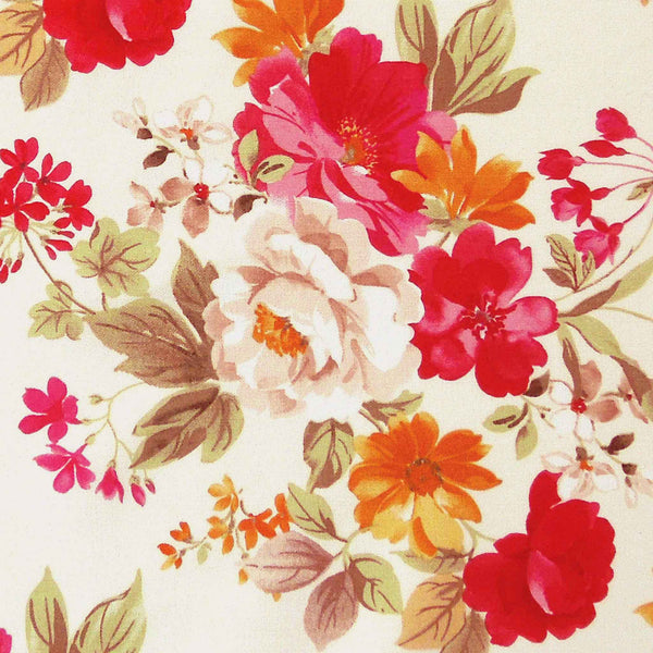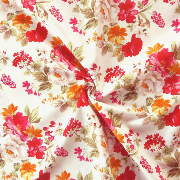 A pretty cotton flower fabric, Farmhouse Floral on cream by Penny Rose fabrics. This fabric has large sprays of flowers in red, pink, gold and white with green leaves on a cream or off-white background. It is a pure cotton flower patterned fabric with a pretty repeating pattern of lovely flower sprays and leaves.