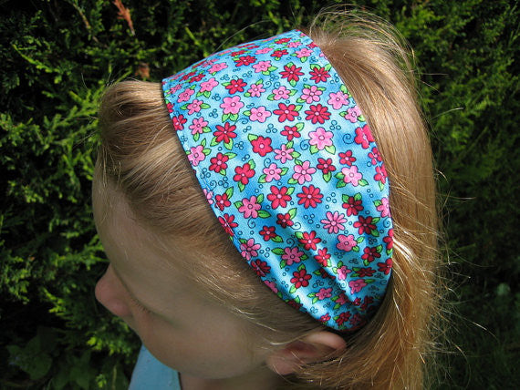 Hairband - Bandana - Turquoise Pink Daisies on Gift Card - Handmade in Pure Cotton
