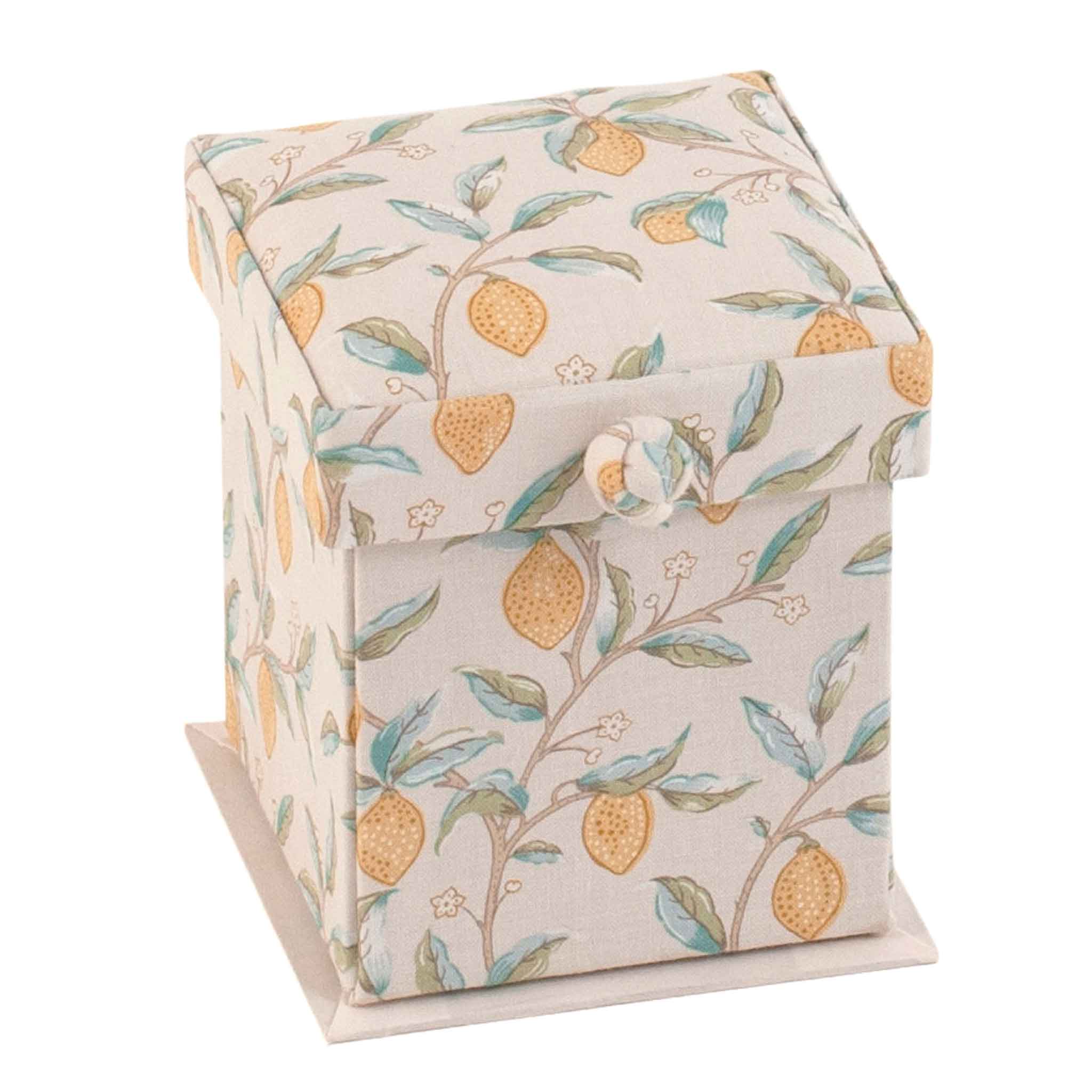 A pretty square Victorian style sewing kit made from 100% cotton. It containing the daily essentials you need for sewing and any repairs. This lovely kit opens out when the lid is removed to display all its contents and is covered in a Morris Lemons print fabric.