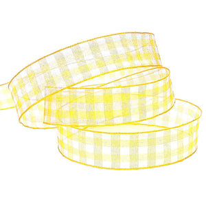 A lovely gold and white sheer gingham ribbon by Berisfords in both 15mm and 25mm widths. This yellow and white woven checked ribbon is perfect for all your craft, sewing, home decorating and gift wrapping projects.