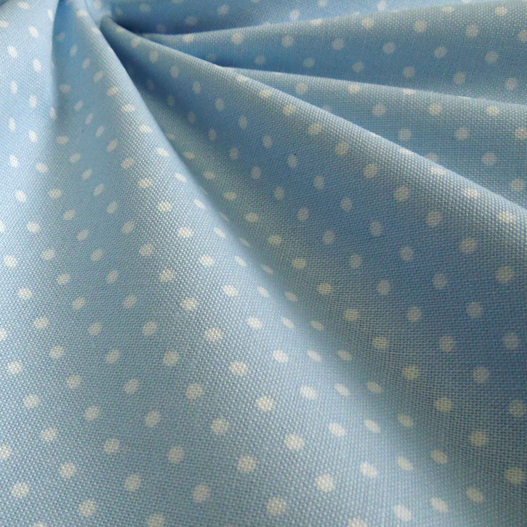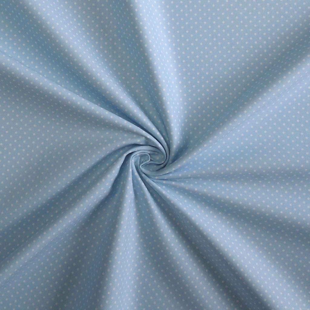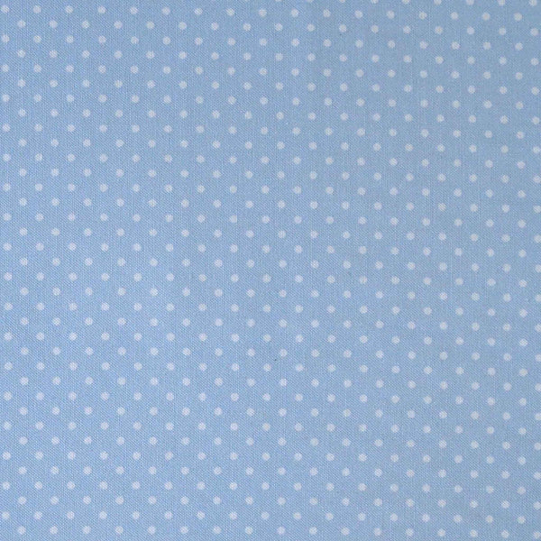 Pastel Blue Small Polka Dot Fabric is a beautiful pure cotton fabric with a small dot pattern of white polka dots on a pale blue background. Suitable for crafts, sewing, patchwork and dressmaking.