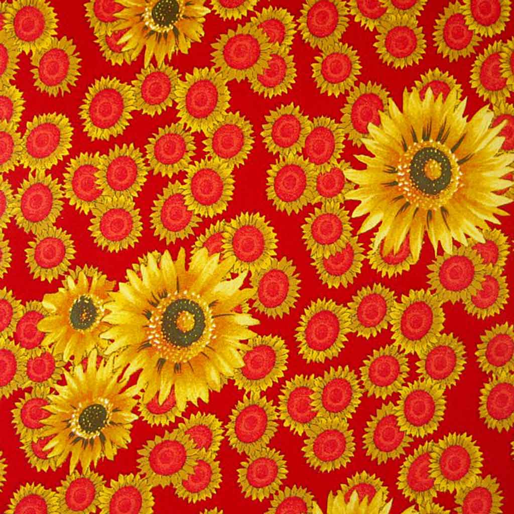 Sunflower cotton fabric is a pretty printed cotton fabric with a bright and cheerful design of both large and small yellow sunflowers on a red background.