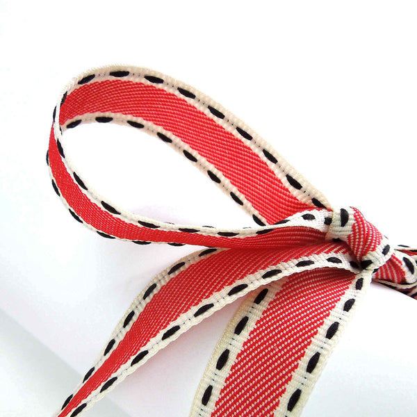 A lovely vintage inspired stitched ribbon with a thick red denim-effect central stripe and contrasting black stitched edges on a cream textured background available in both 15mm and 25mm widths.