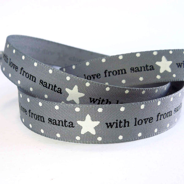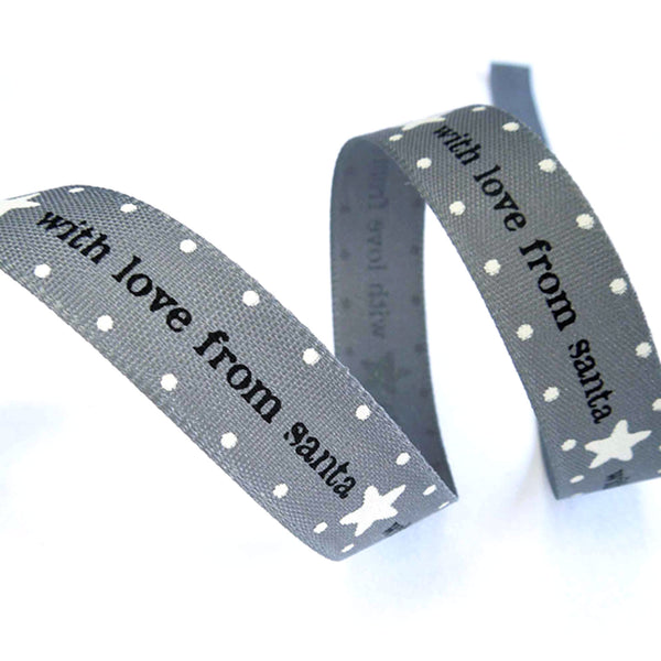 A lovely Christmas ribbon with the words 'with love from santa' in black separated by a white star. The smoked grey background has a row of little white dots running down each edge to complete the design.